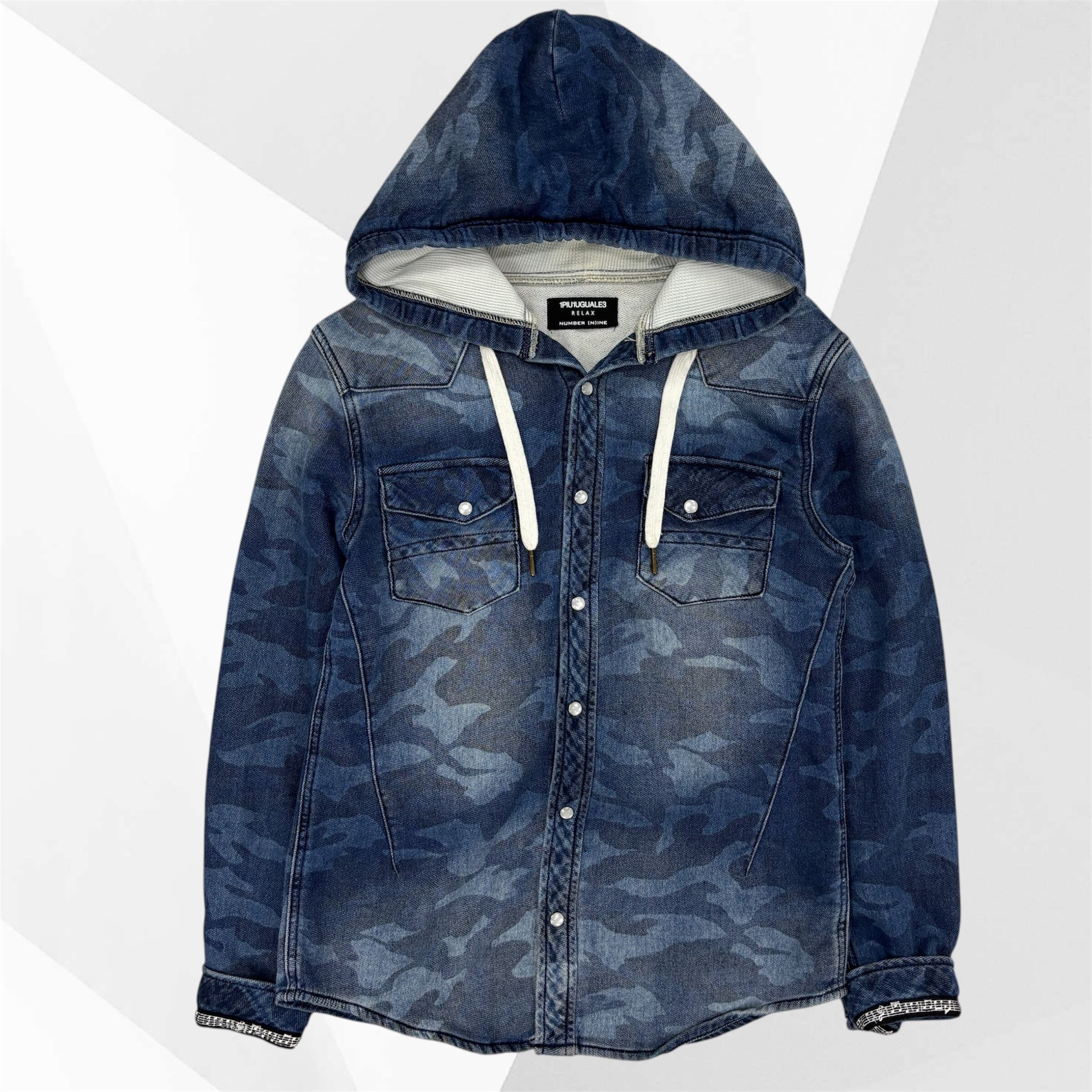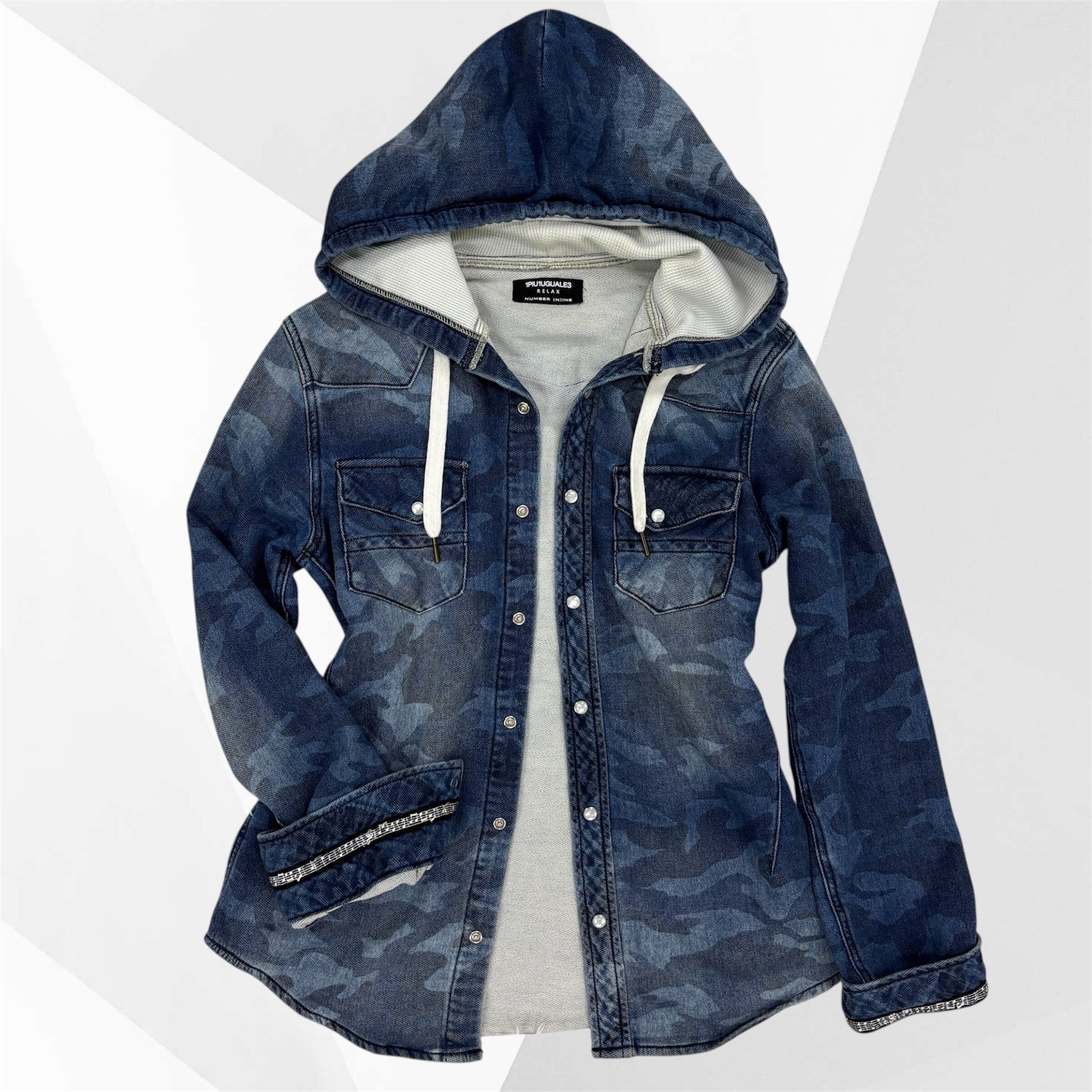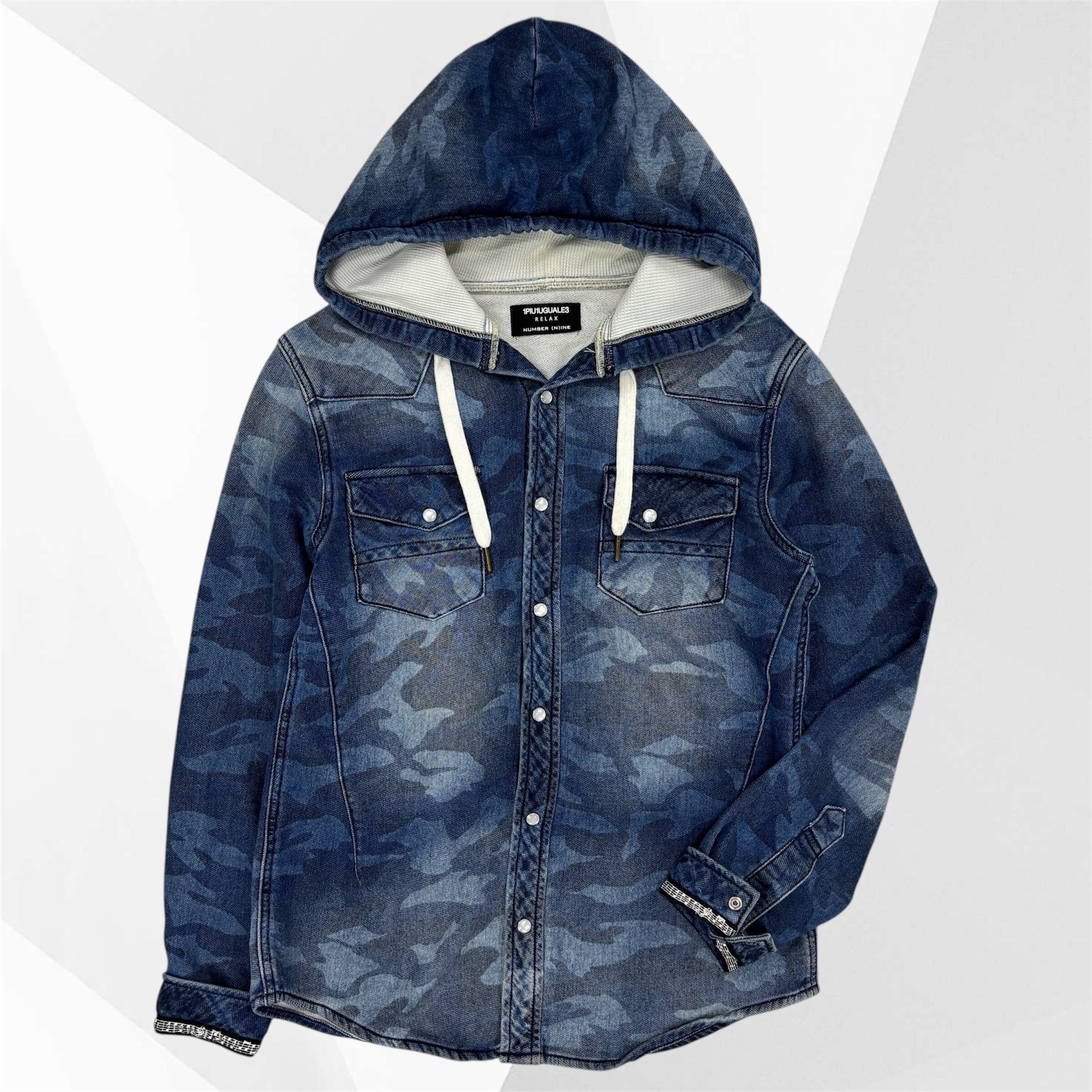 ストリートとラグジュアリーを融合させた「RELAX)ラインから、ブルーカモ柄のフード付きデニムシャツ。