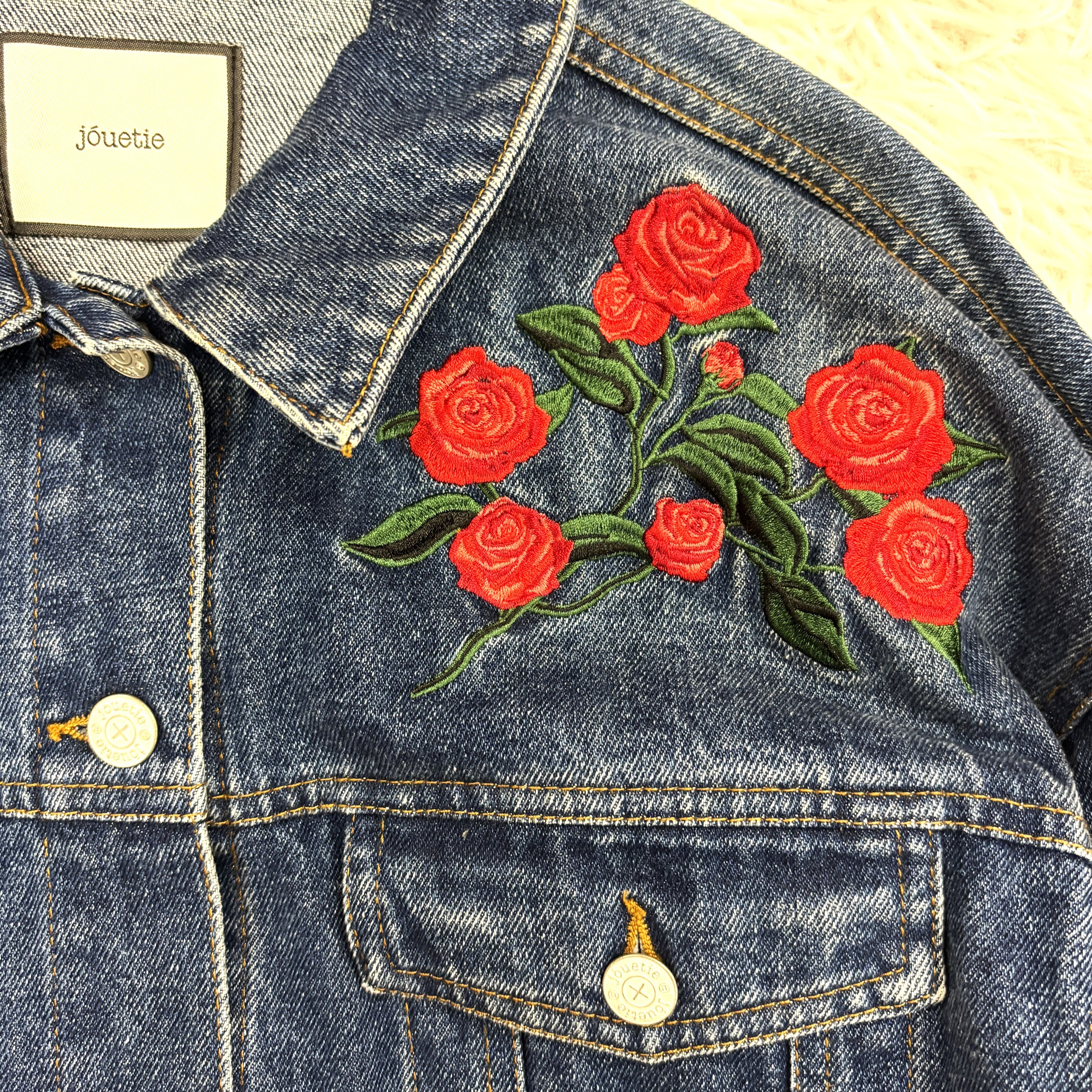 ジュエティらしい繊細な薔薇刺繍とバッグモチーフの刺繍が施された、存在感あるデニムジャケット。