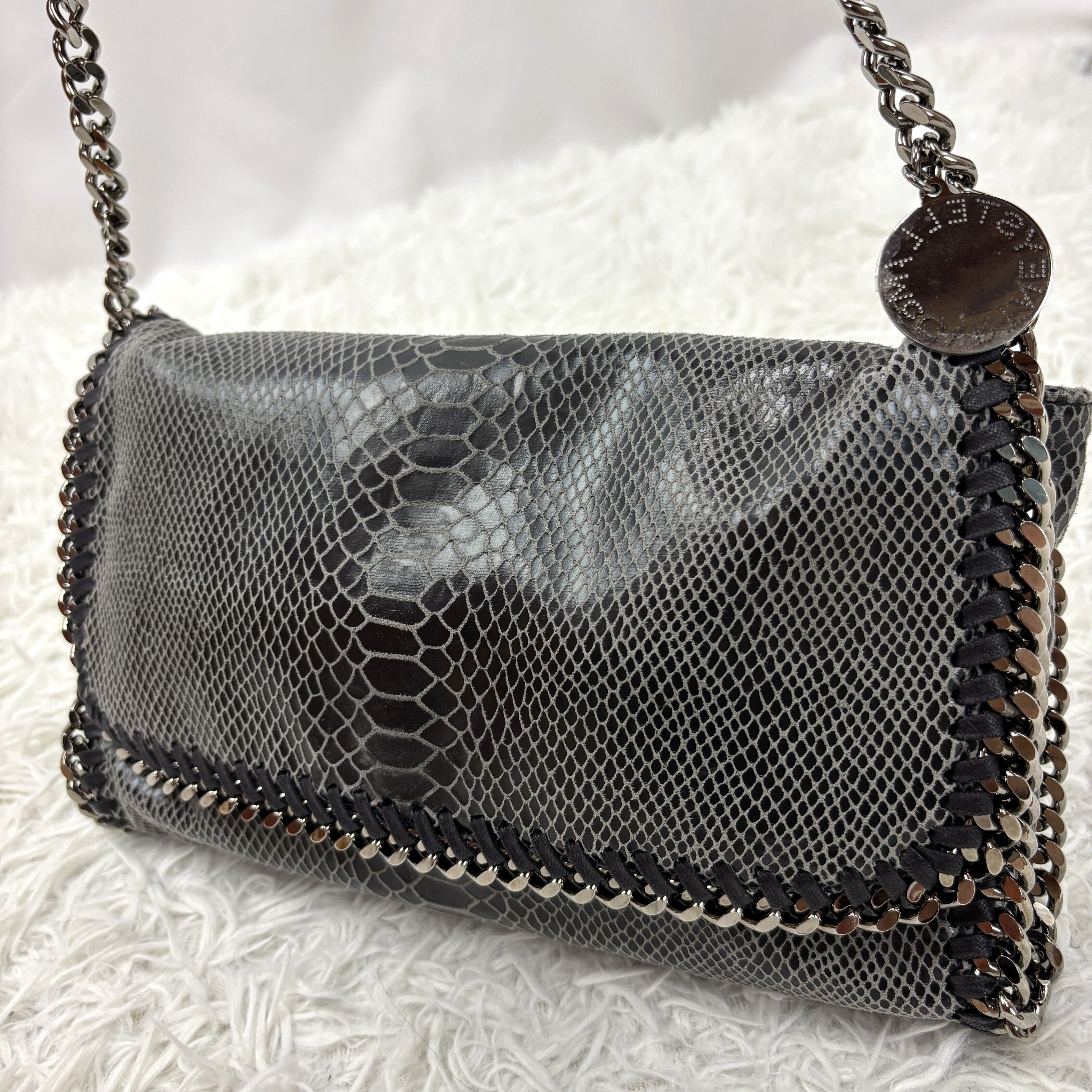 ステラ・マッカートニーの中でも希少なスネーク型押しデザインのチェーンショルダーバッグ。動物由来素材を一切使用しないエコレザーを採用し、ブランドの哲学とラグジュアリー感を両立した逸品です。