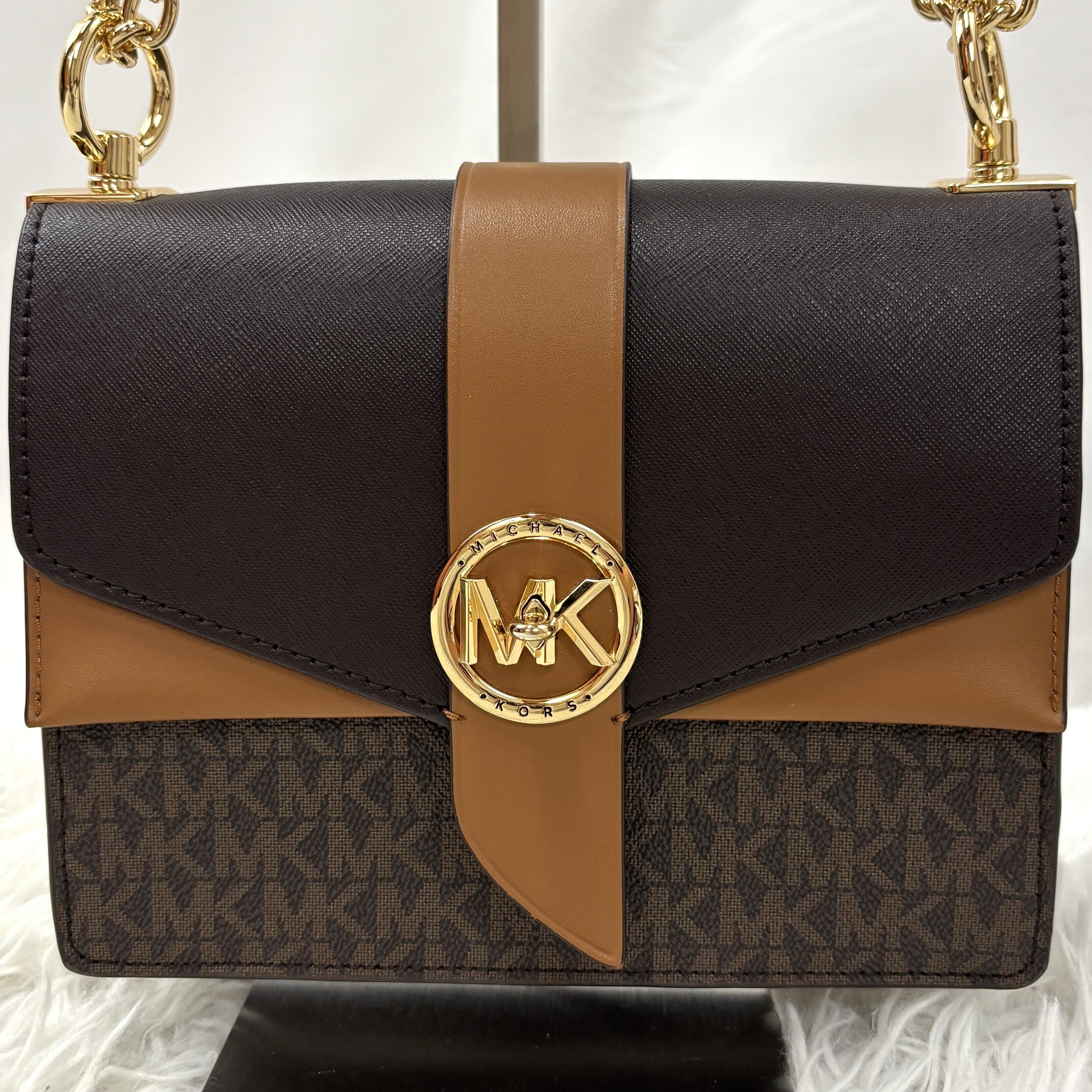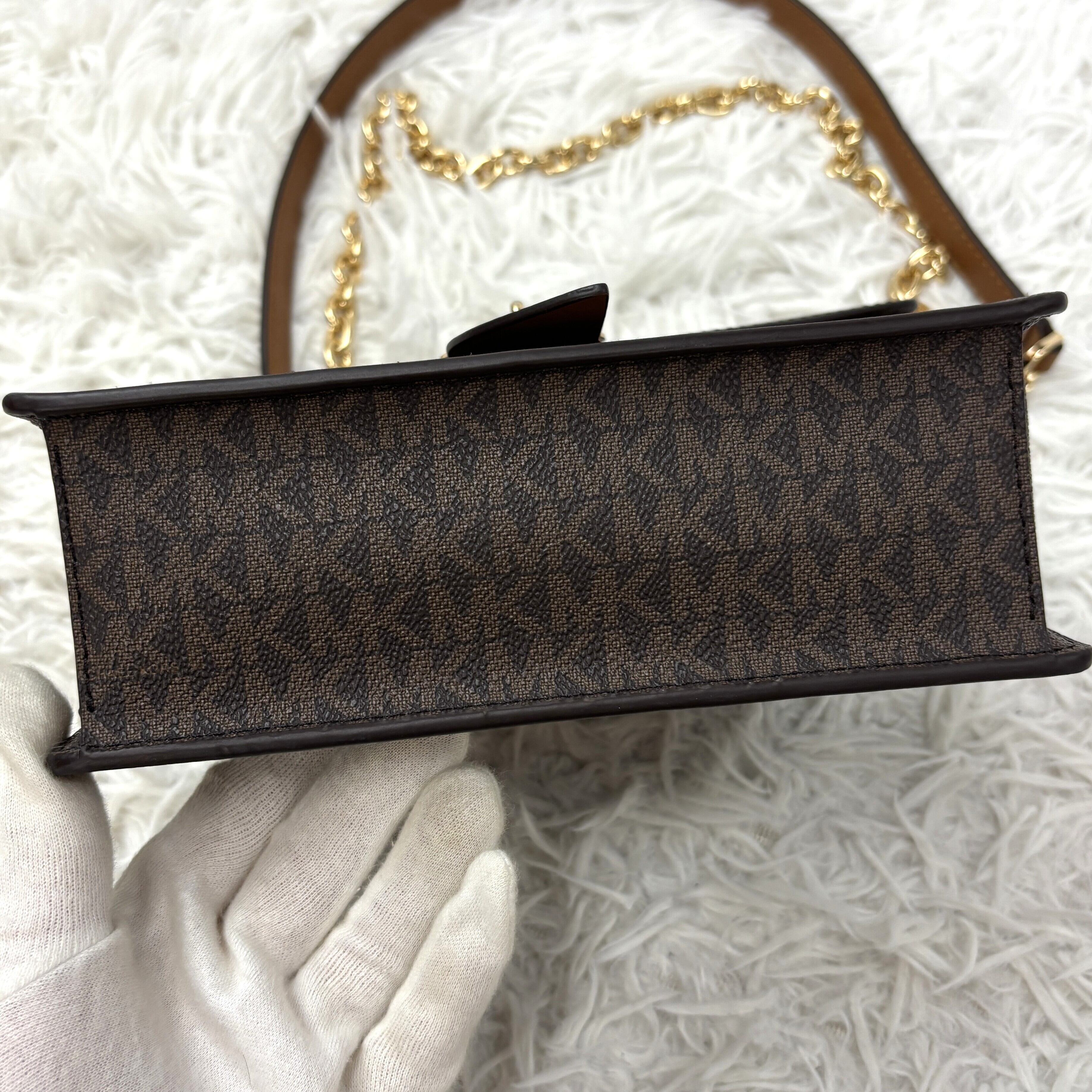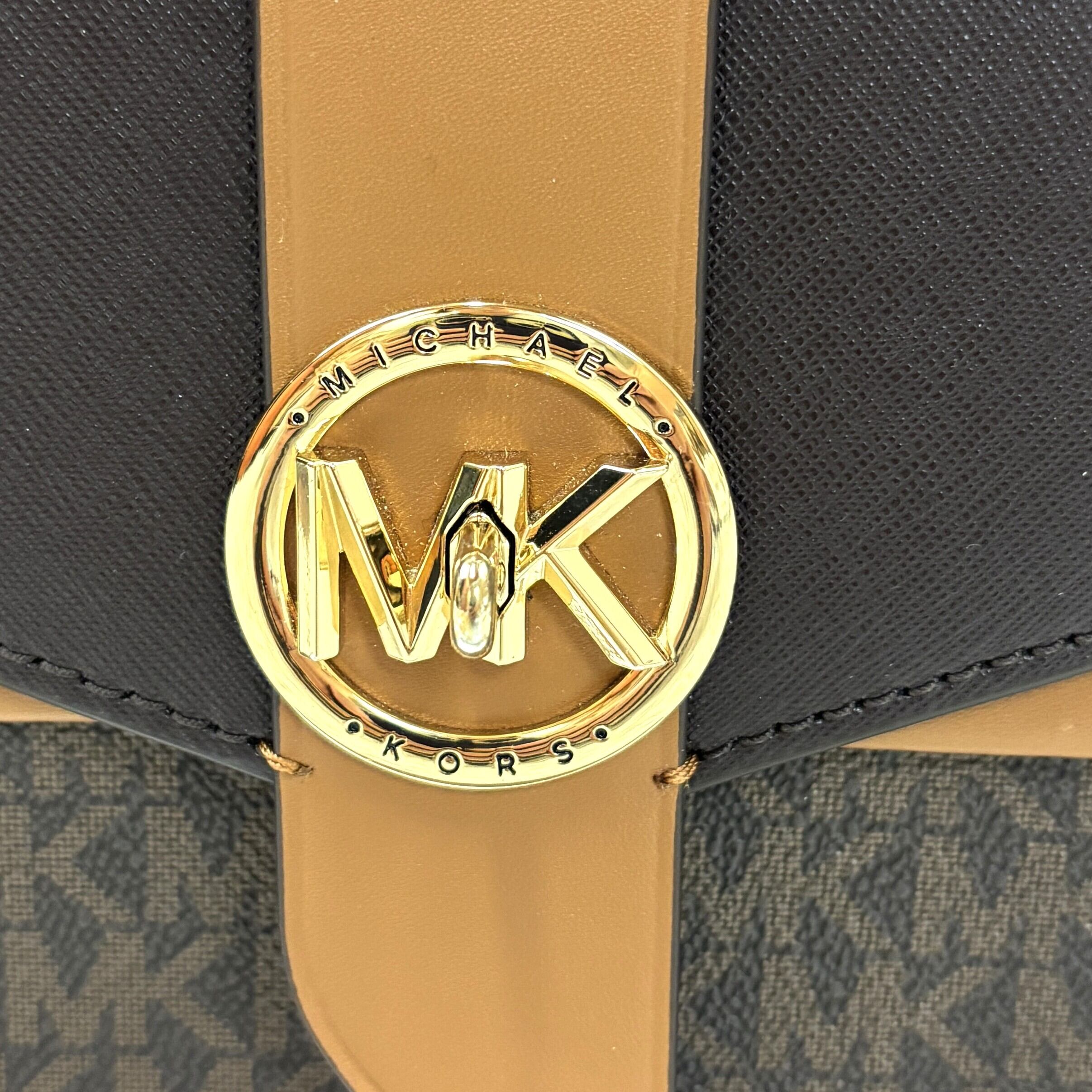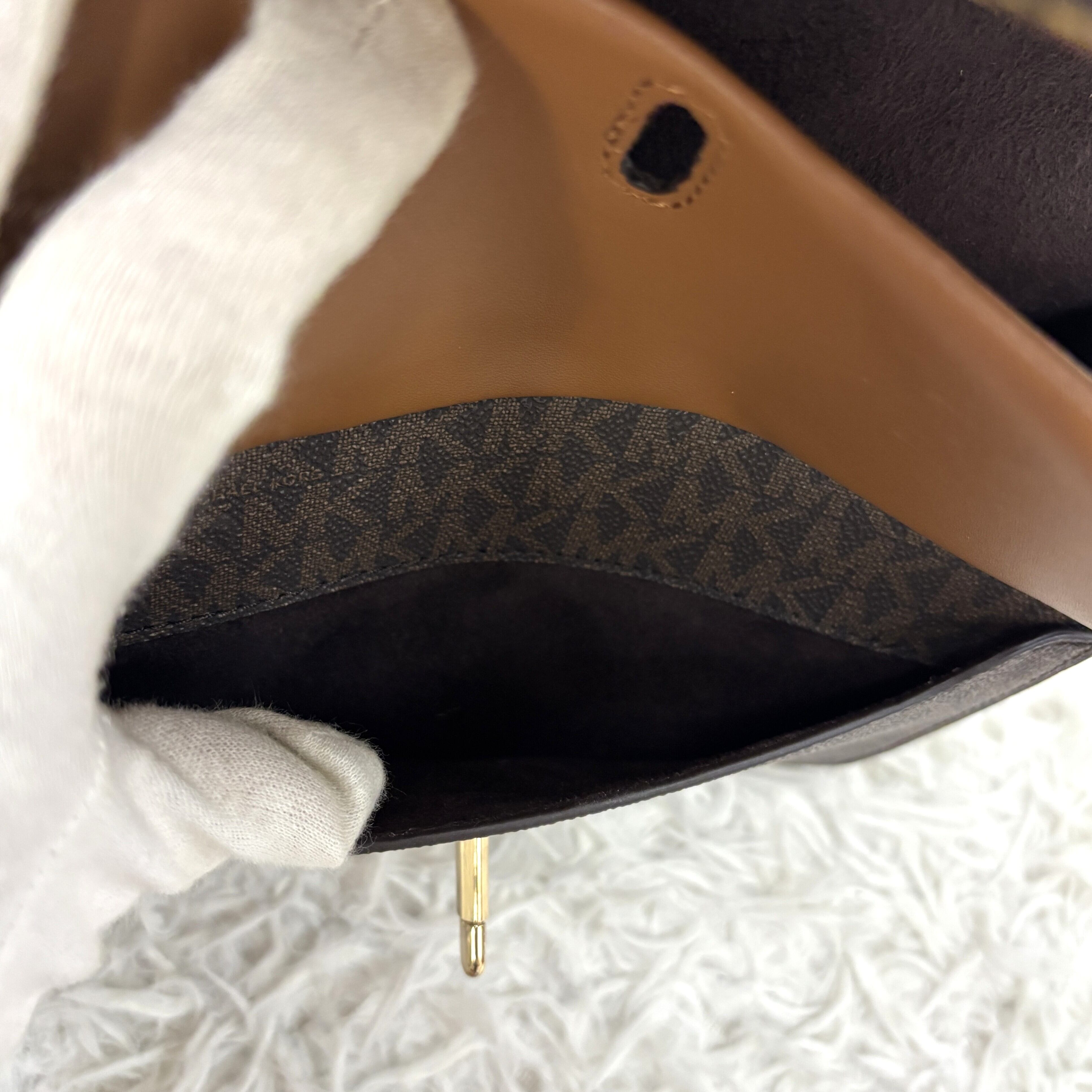 ブランドを象徴するMKシグネチャー柄が全面に施され、洗練された印象を演出します。