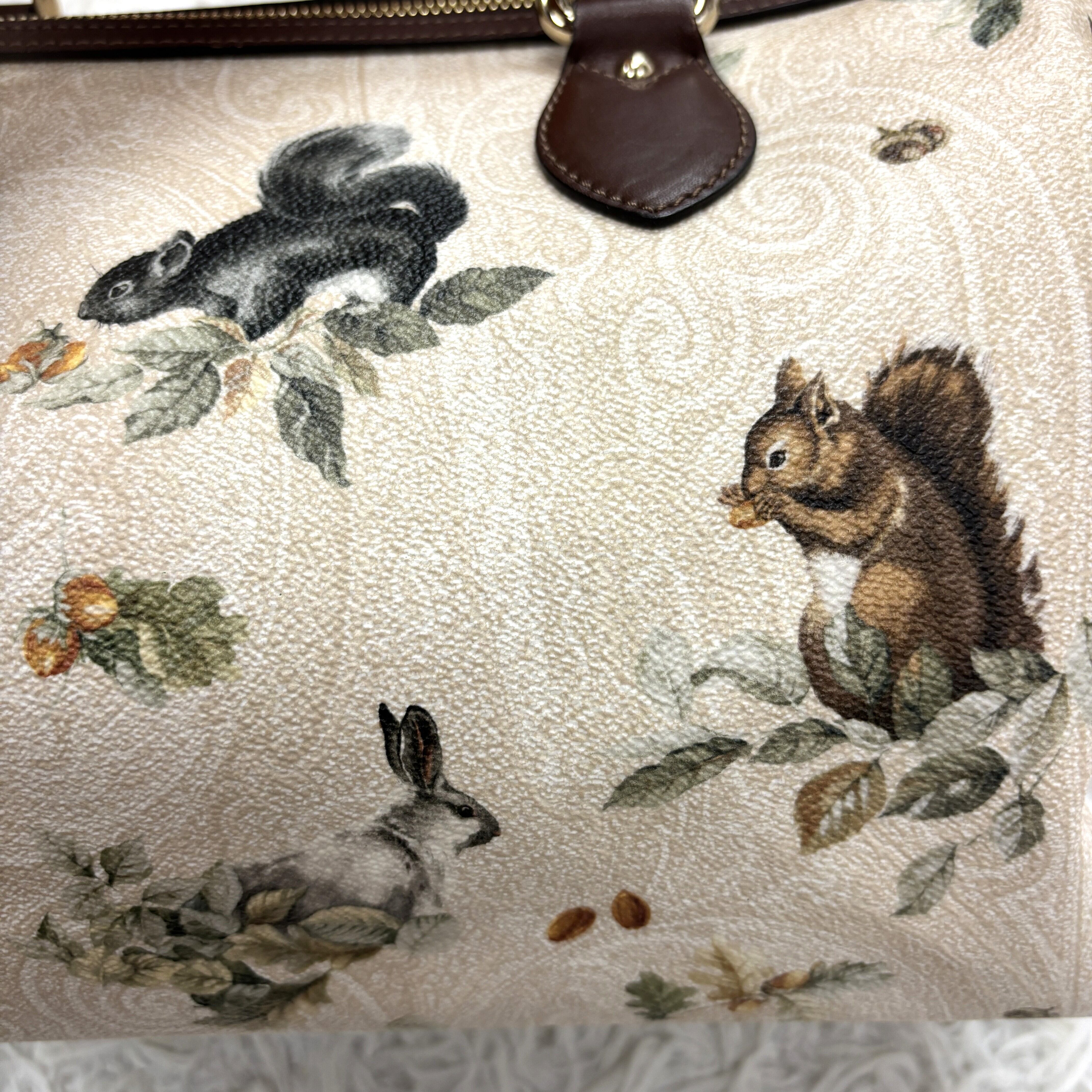 ・カラー :アイボリー/ブラウン(リス・ウサギ)/グリーン(葉)/ベージュ・オレンジ(どんぐり)/ダークブラウン(ハンドル・トリム)/ゴールド(金具)/ライムグリーン(内側)