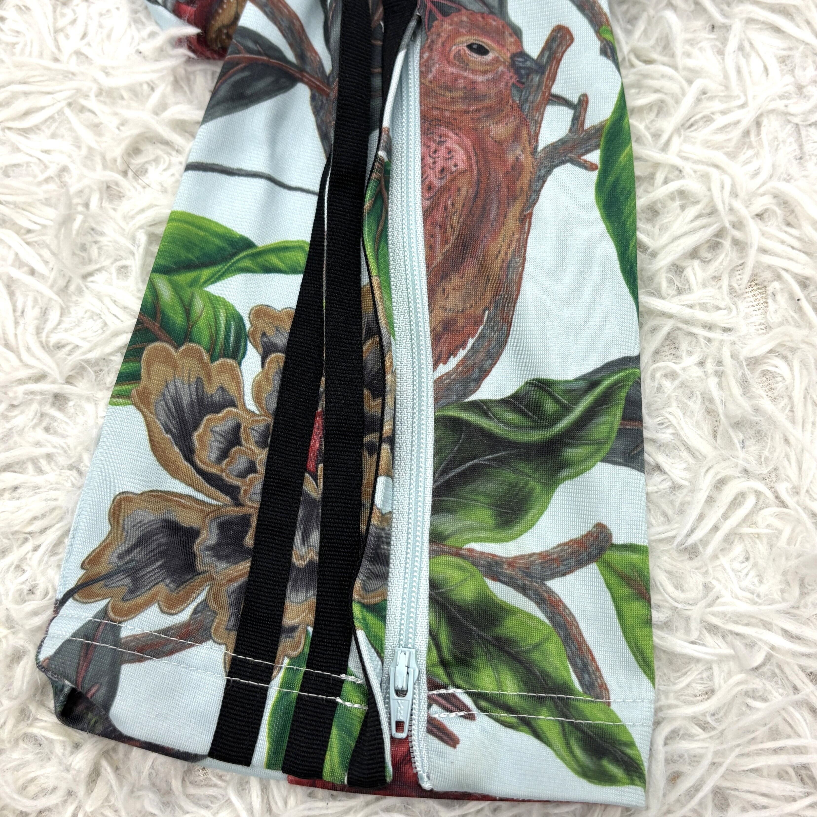 鮮やかな花鳥柄が全面に広がり、まるでアートを着るような感覚。