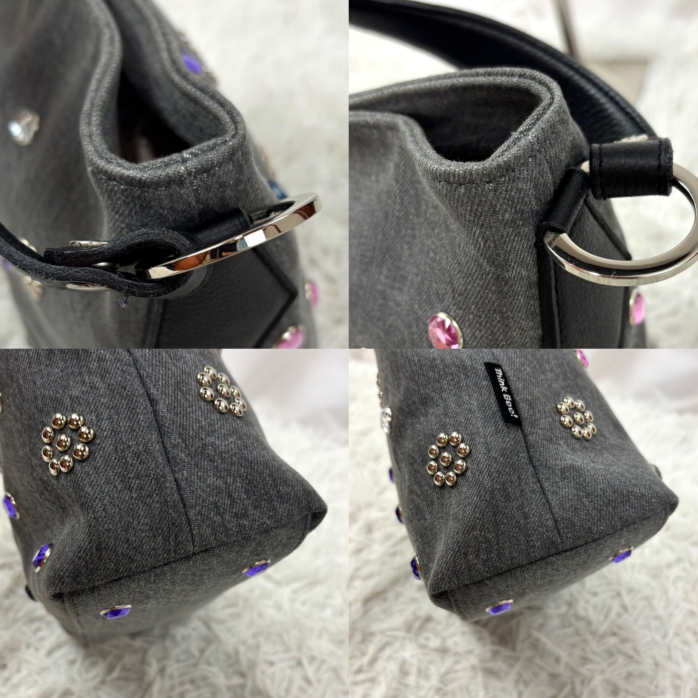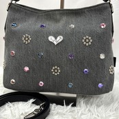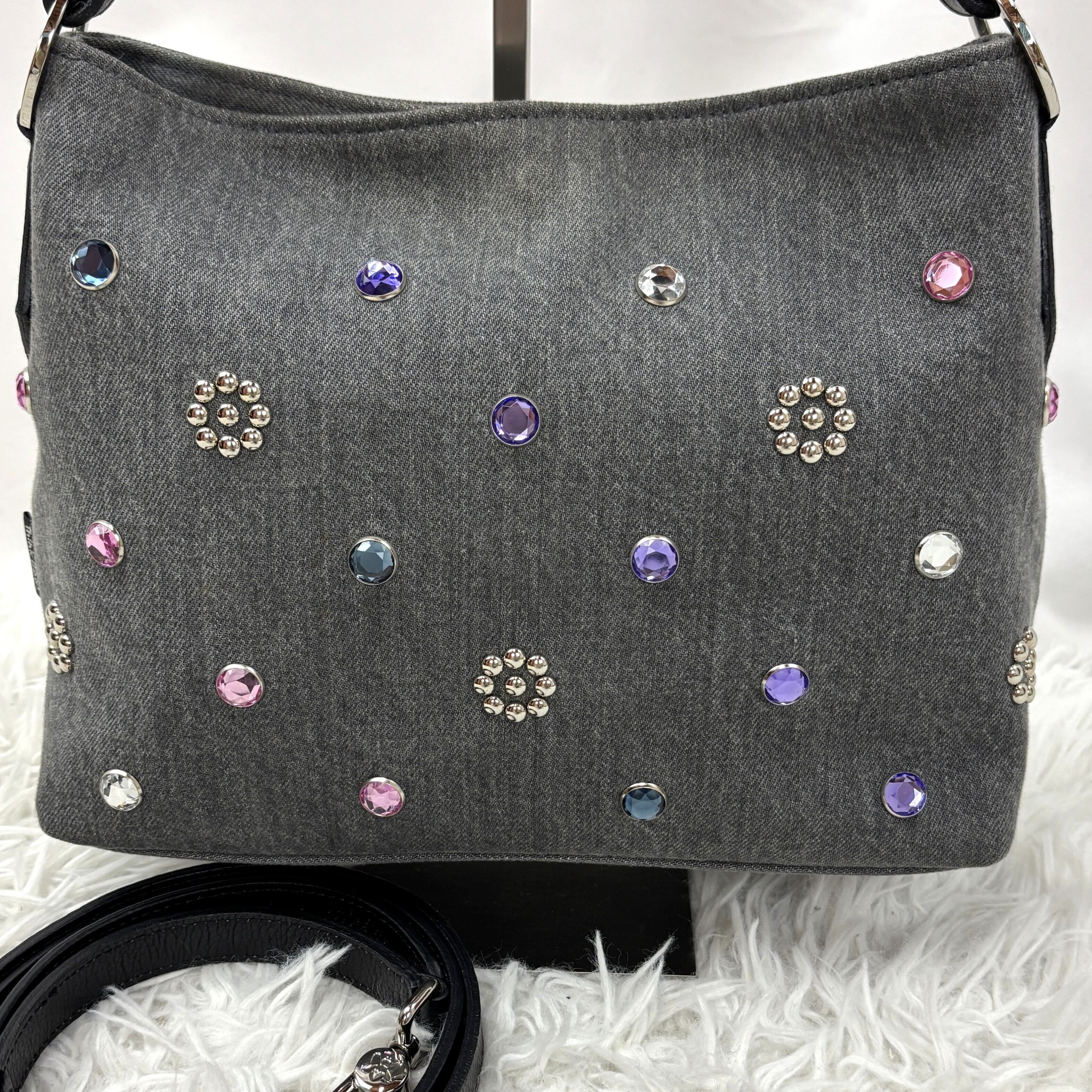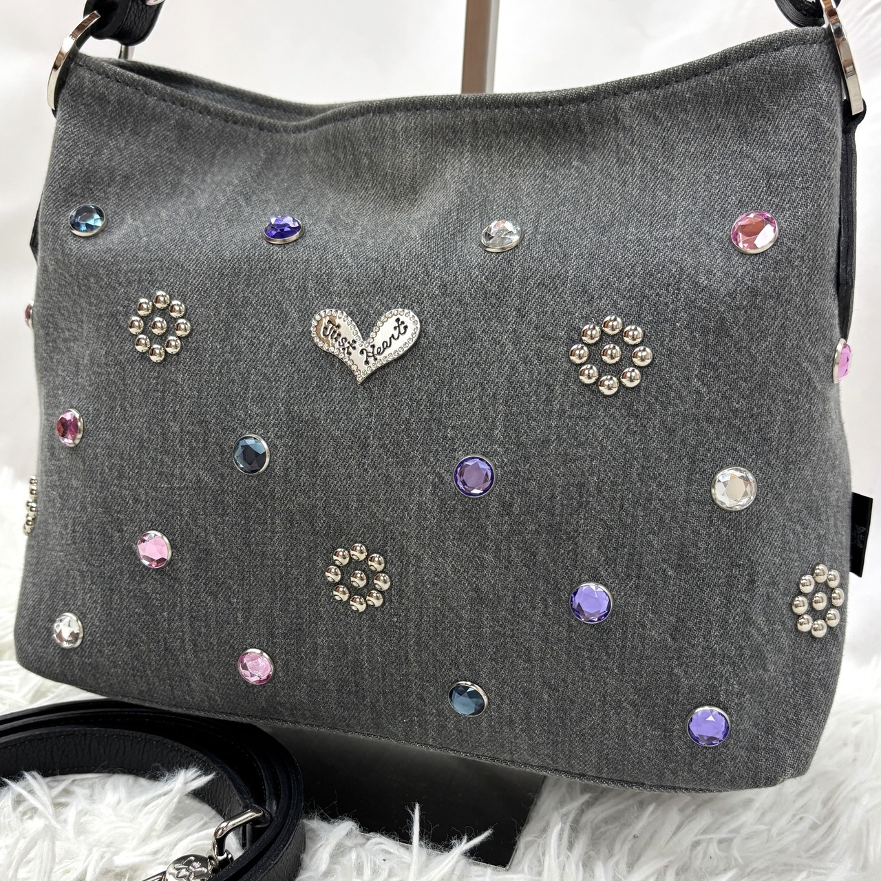 バッグ全体に散りばめられたカラフルなラインストーンとスタッズ装飾が、まるでジュエリーのような輝きを放ちます。