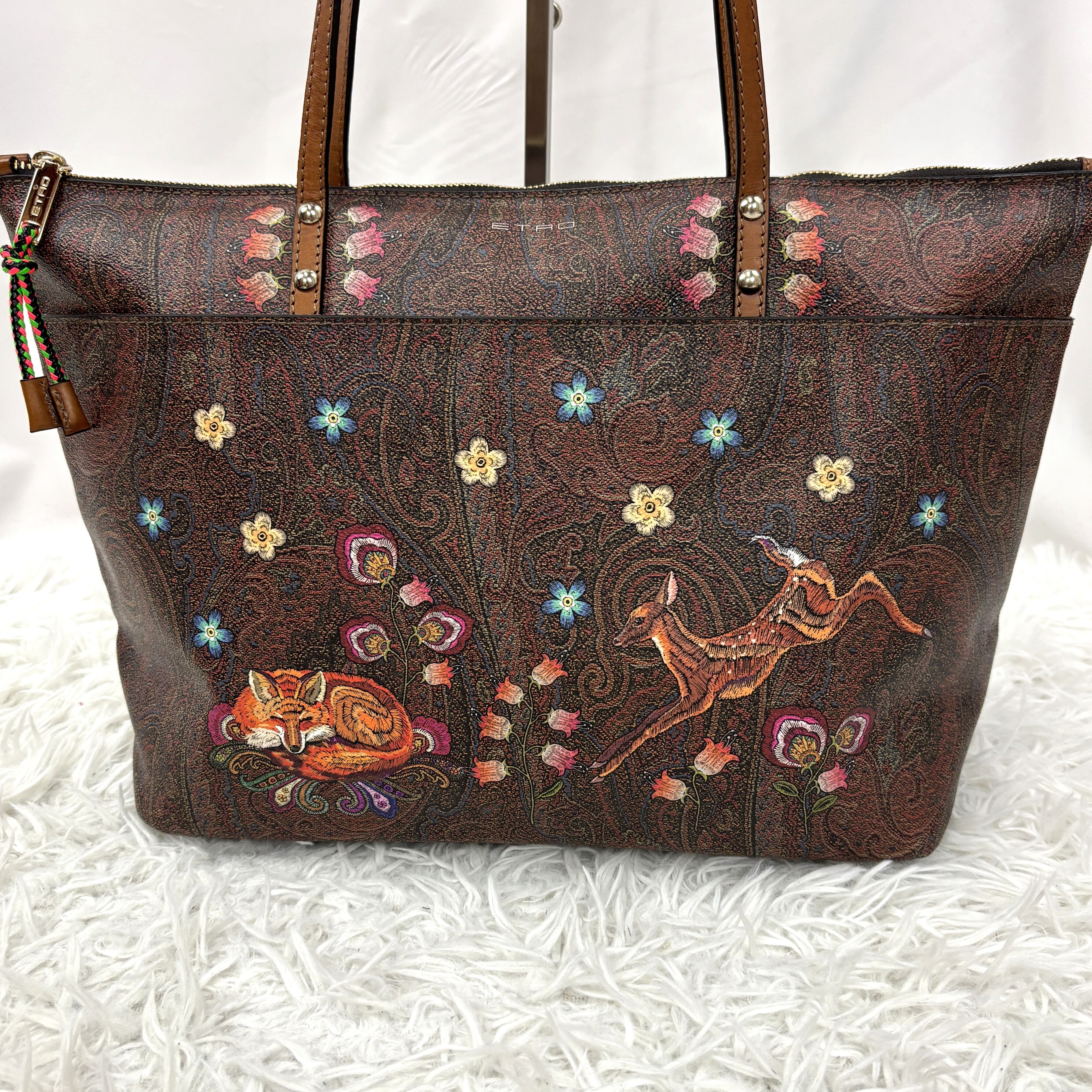 ETROのアイコニックなペイズリーに、幻想的なキツネとバンビが施されたアートピースのような逸品。