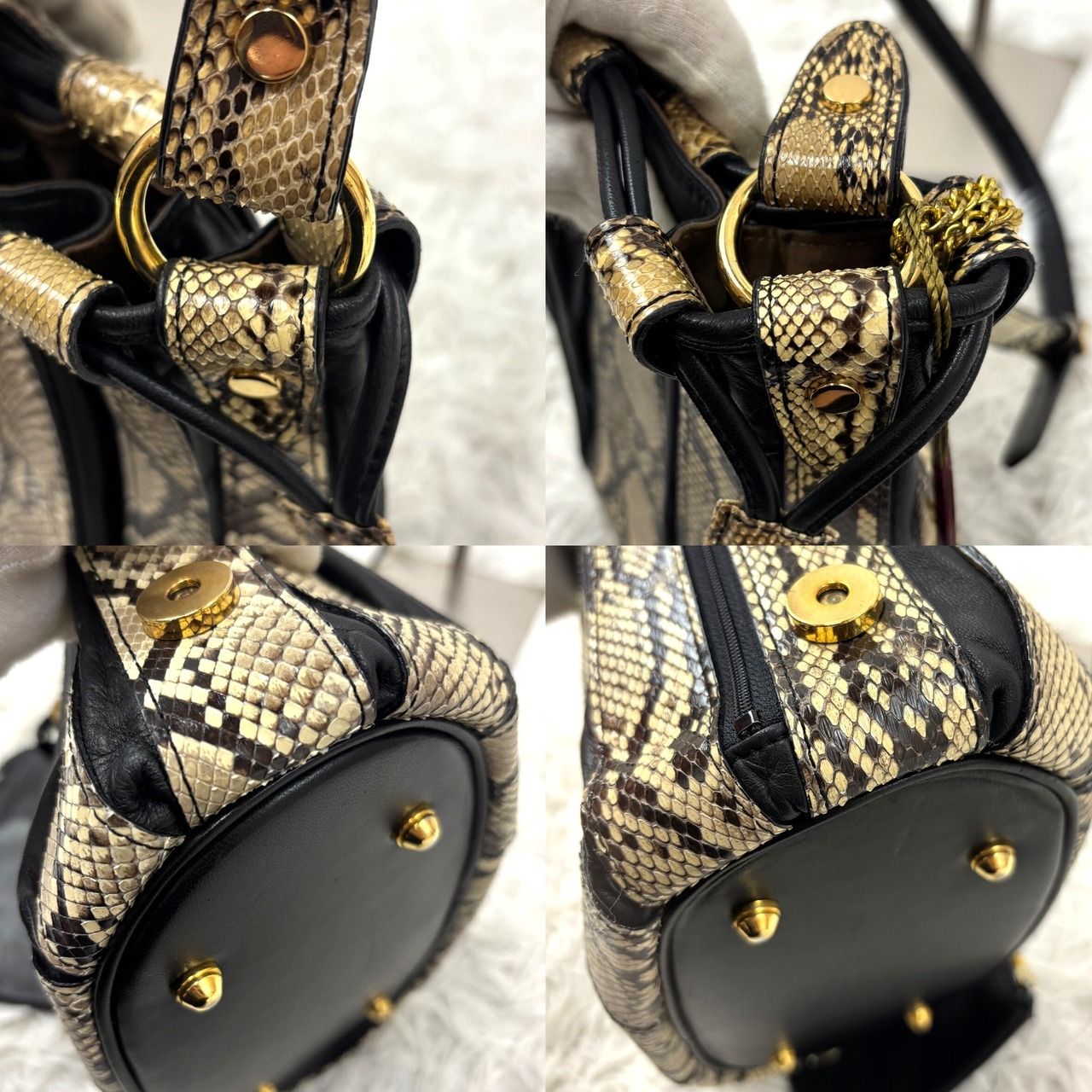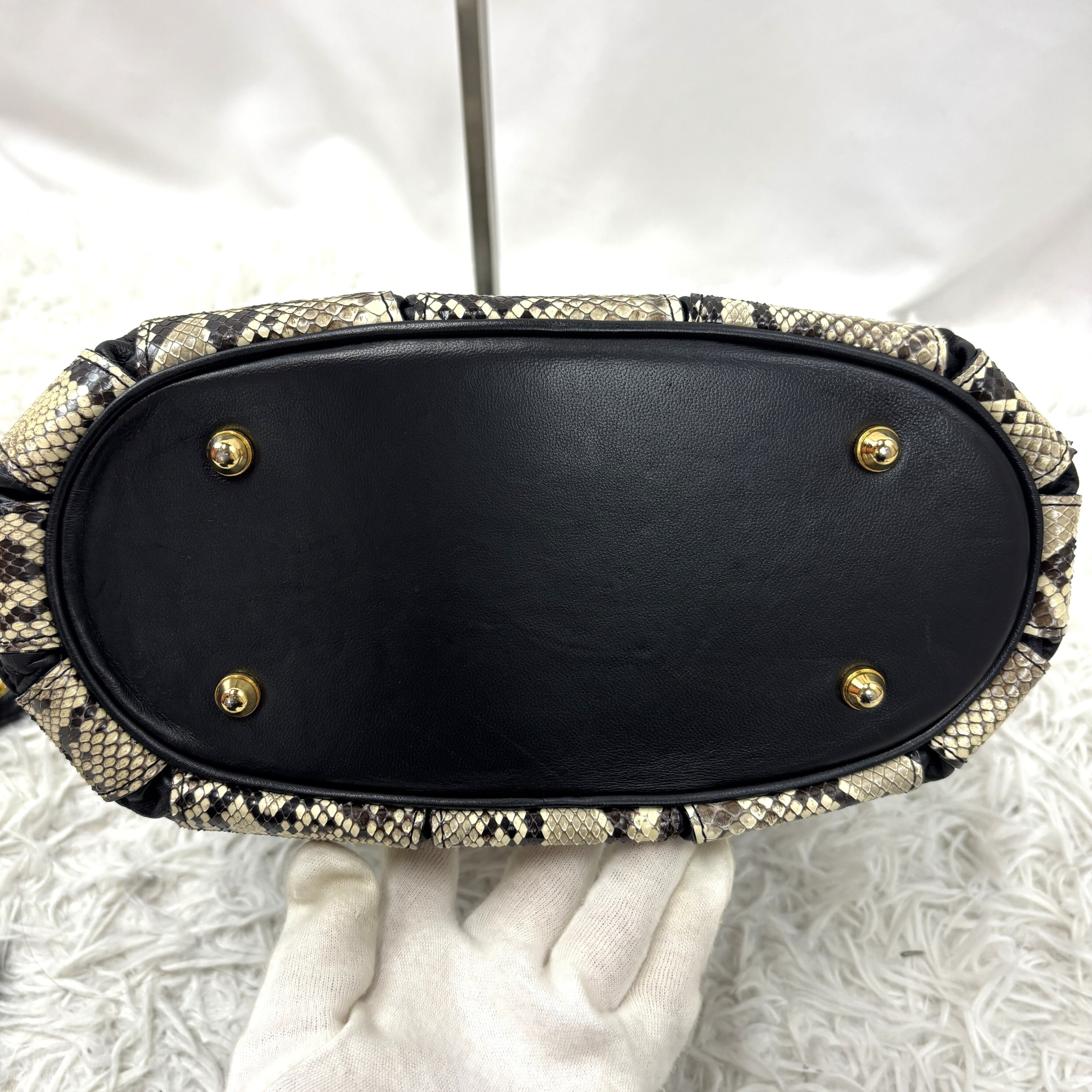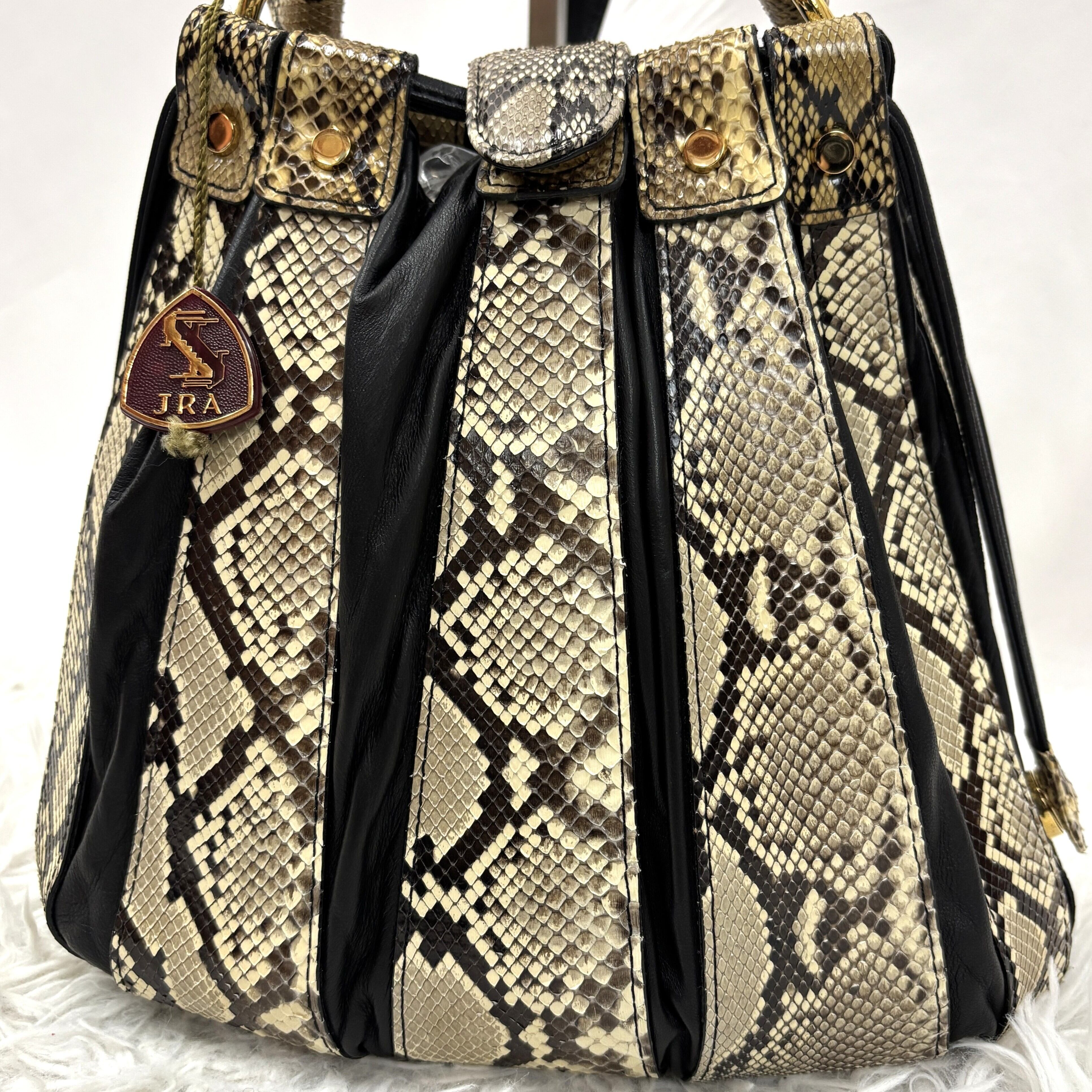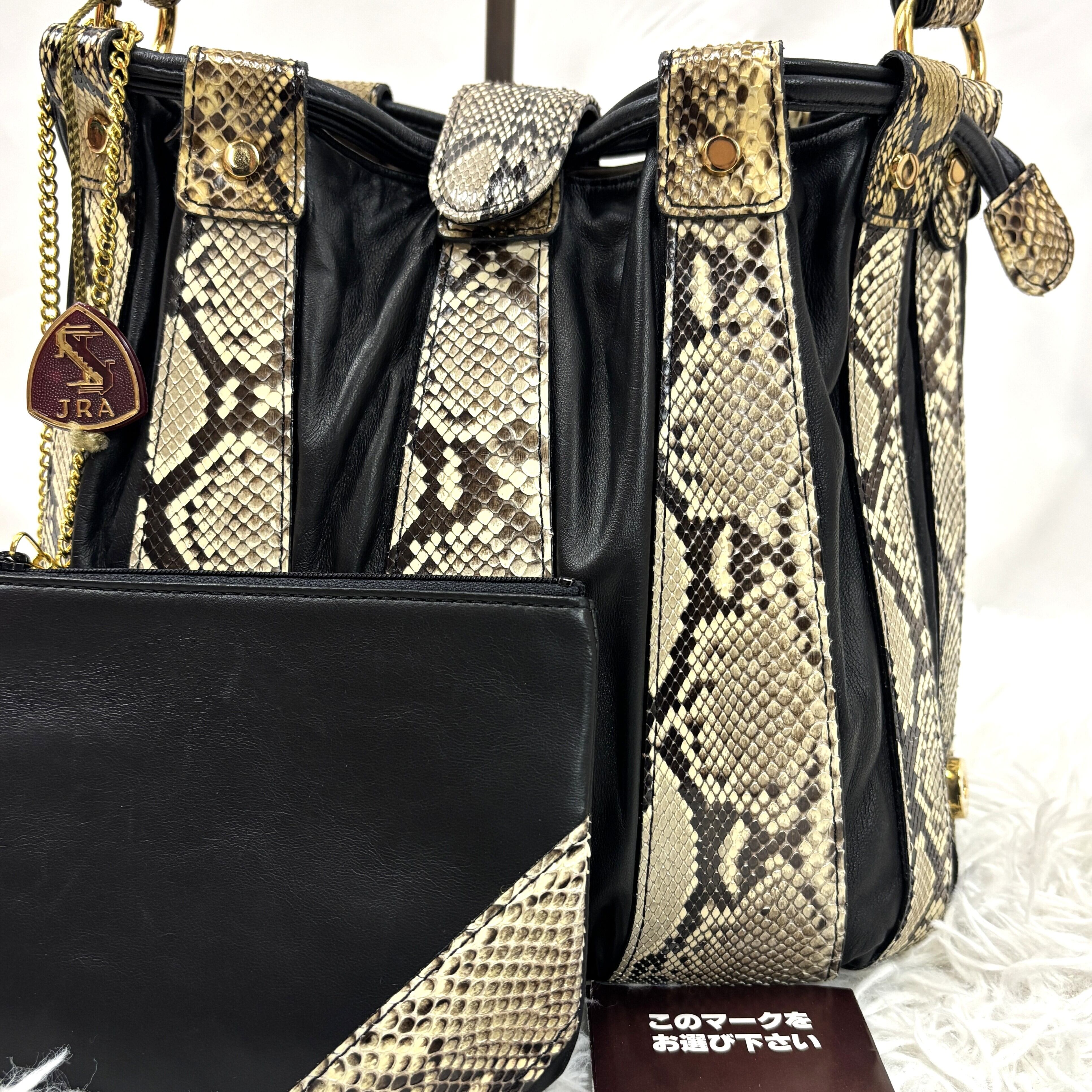 希少価値の高いJRA認定ダイヤモンドパイソンを贅沢に使用した、巾着型にもトート型にも使える2Wayショルダーバッグ。