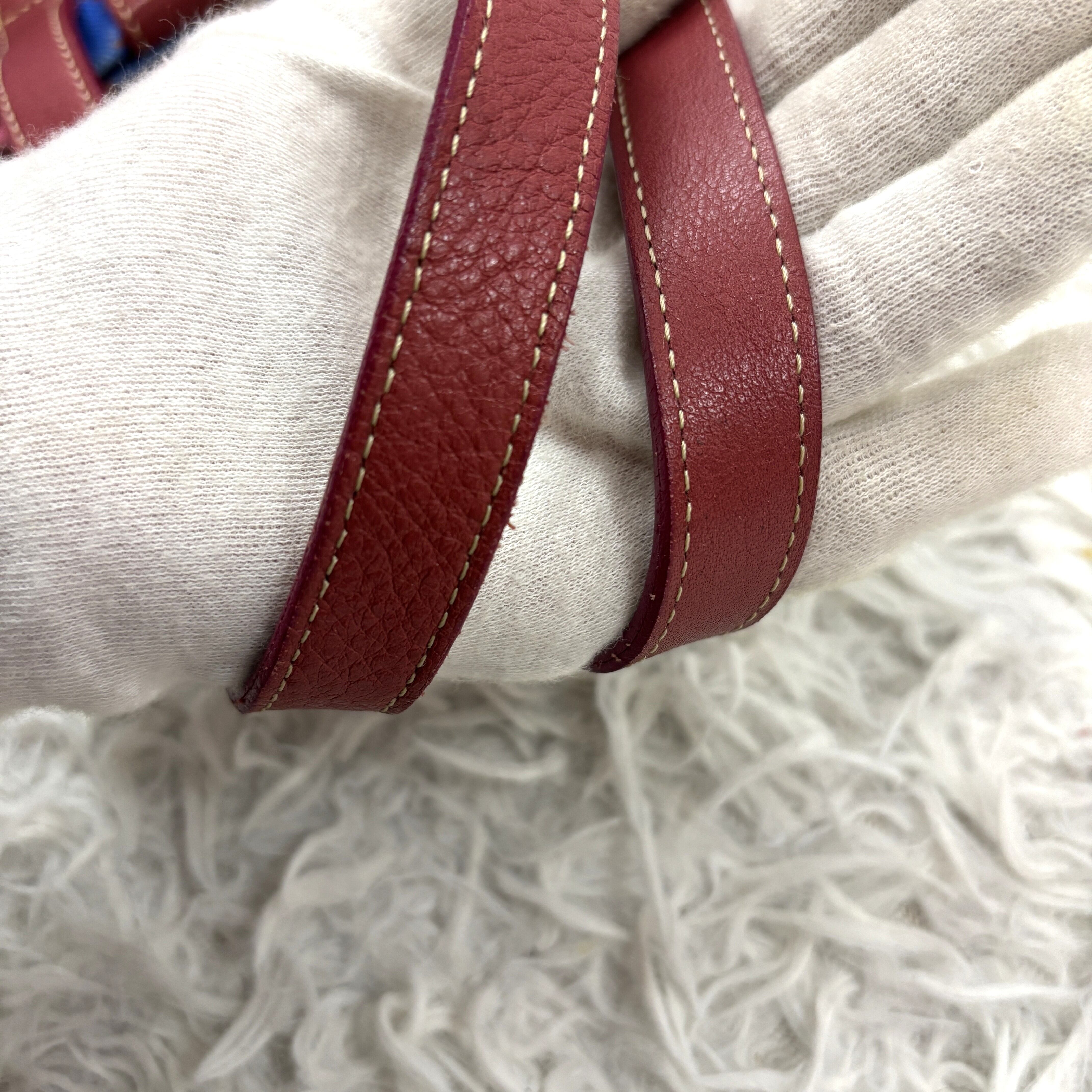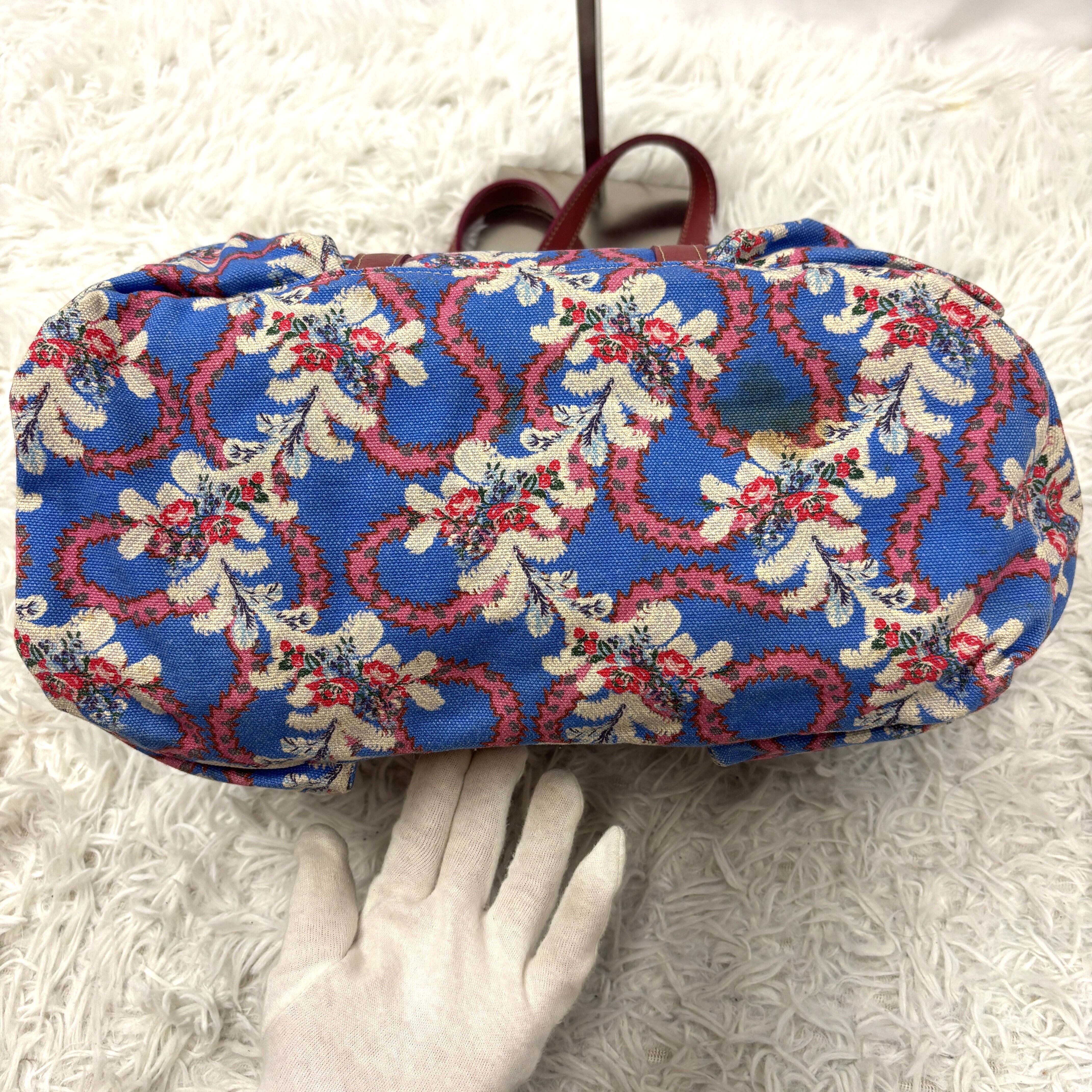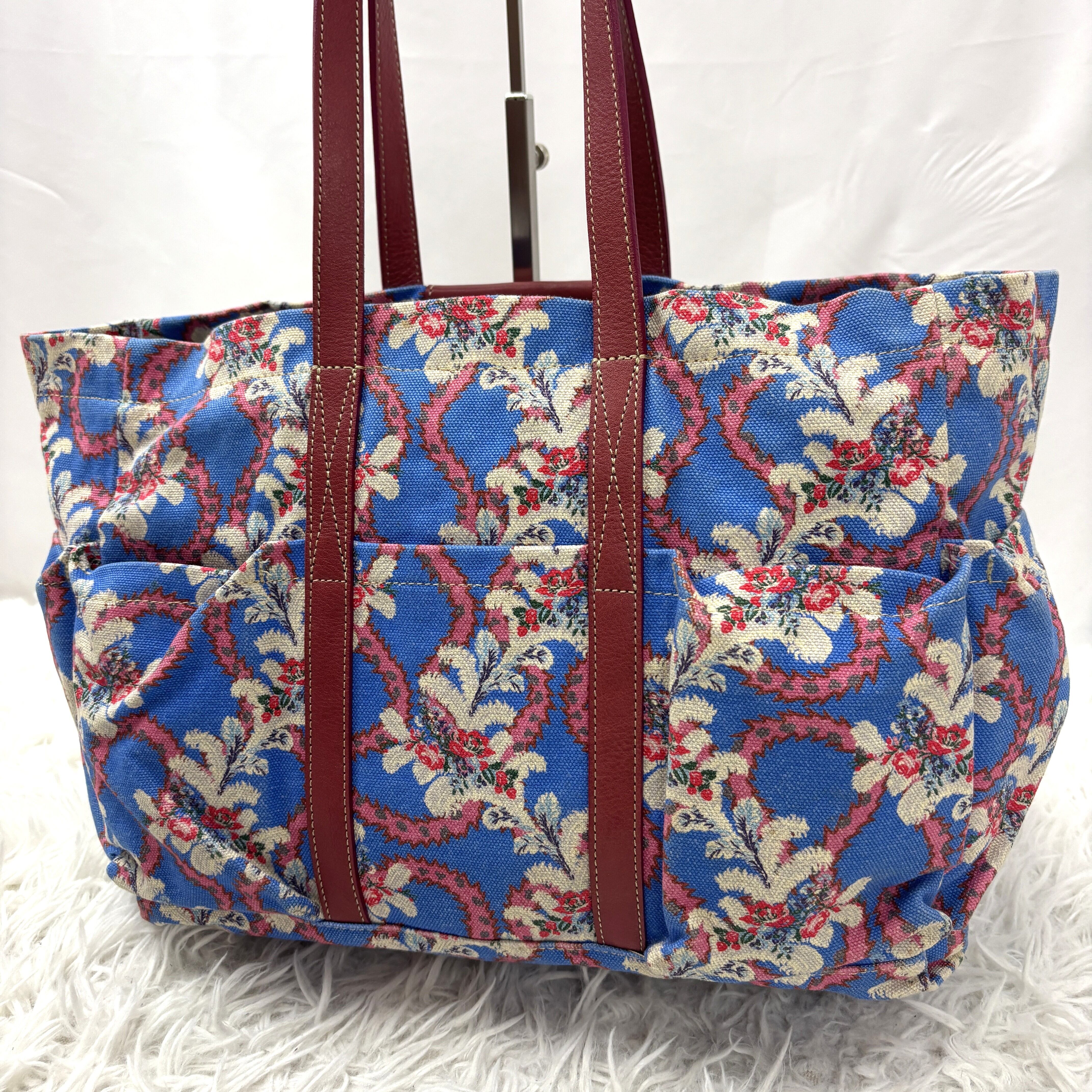 ブルーのキャンバス生地をベースに、ピンクのスイグル模様と白い花柄が描かれ、ハンドルやポケットの縁取りには落ち着いた赤茶色のレザーが使用されています。