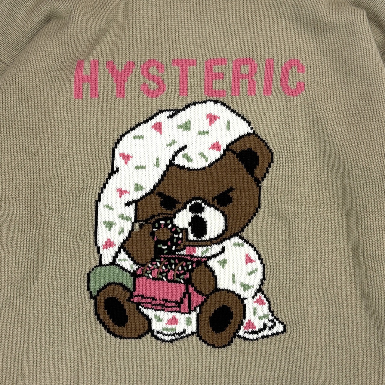 ピンクのHYSTERICロゴと、ブランケットに包まれたクマがドーナツを抱えるユニークなデザインは、見る人の記憶に残るインパクト。