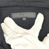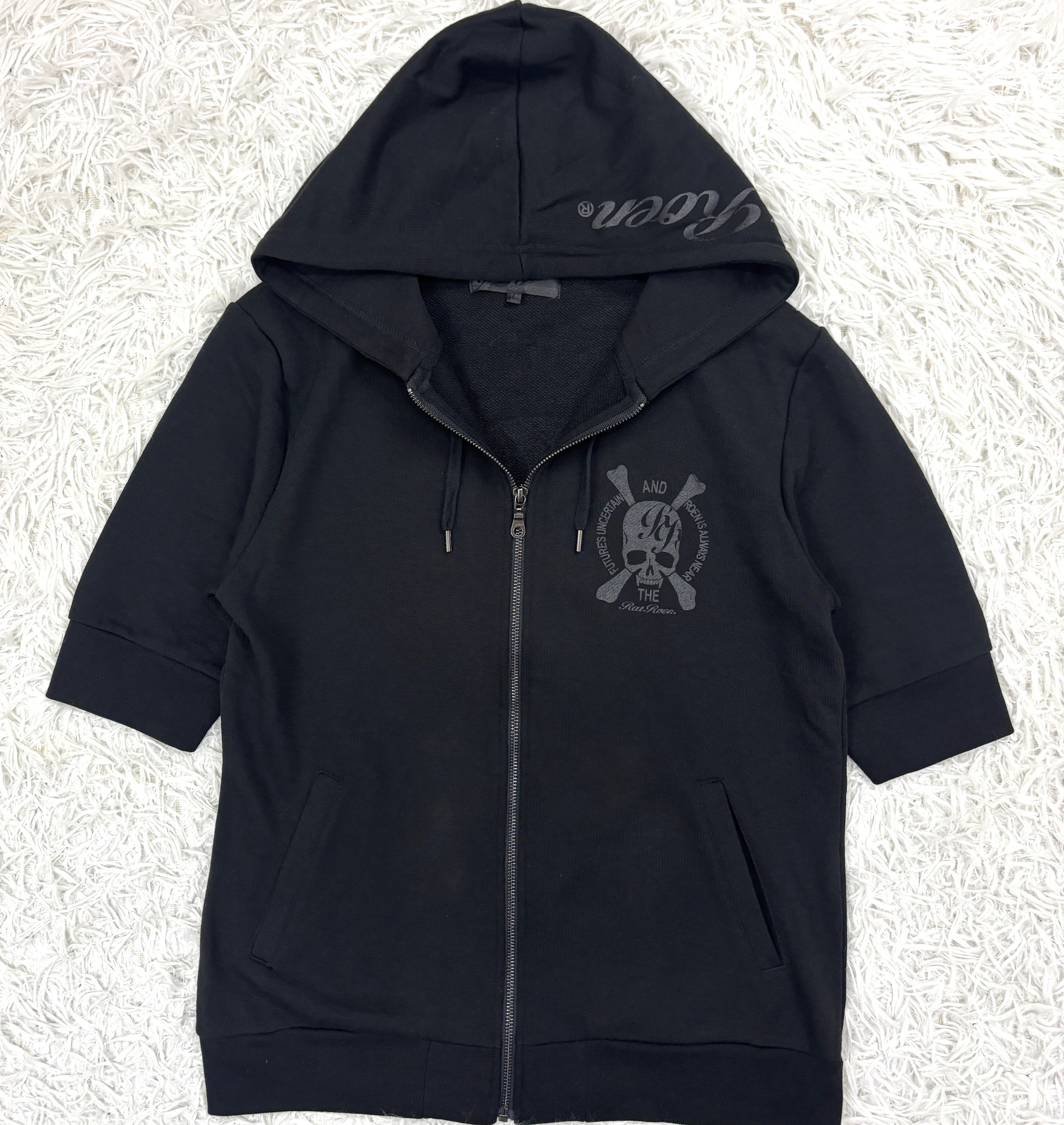 フードにはブランドロゴ入り、胸元にもRat RoenⓇの筆記体プリントが施された、細部まで世界観を貫いた一着です。