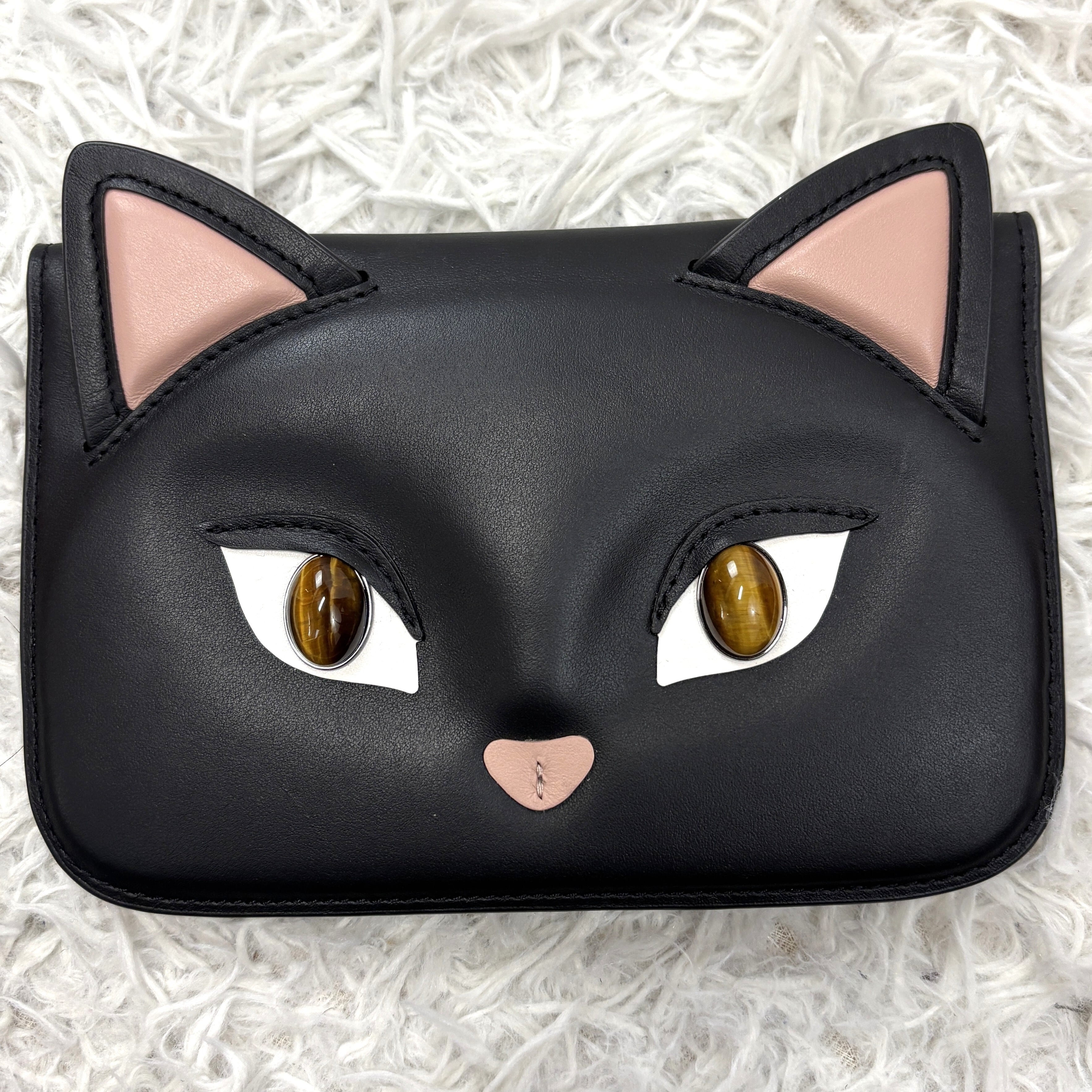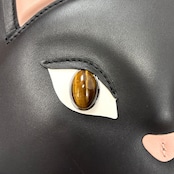 艶やかなブラックレザーに、立体的な耳・リアルなタイガーアイの瞳・刺繍のピンクノーズが施された、遊び心と上質感を兼ね備えた逸品です。