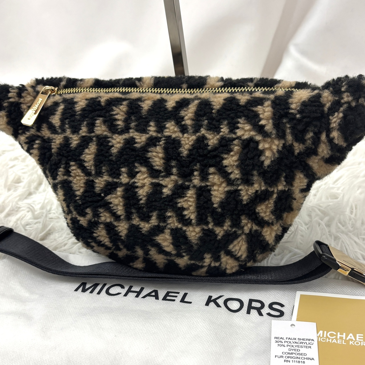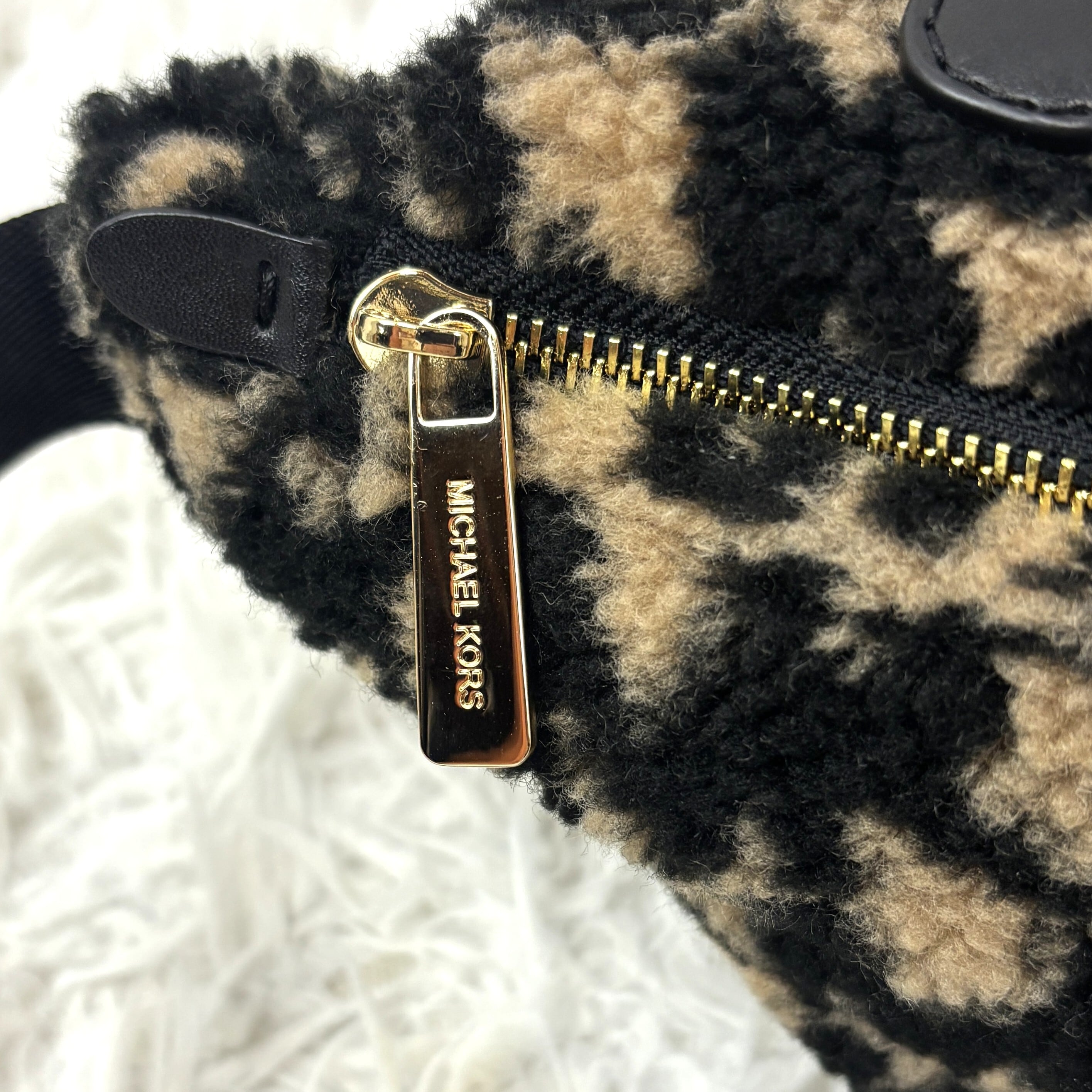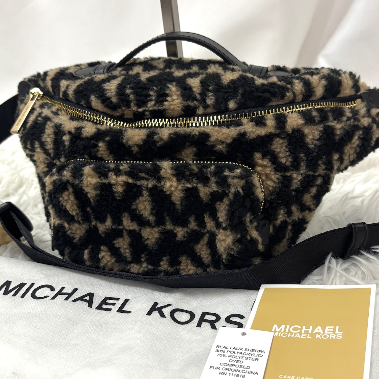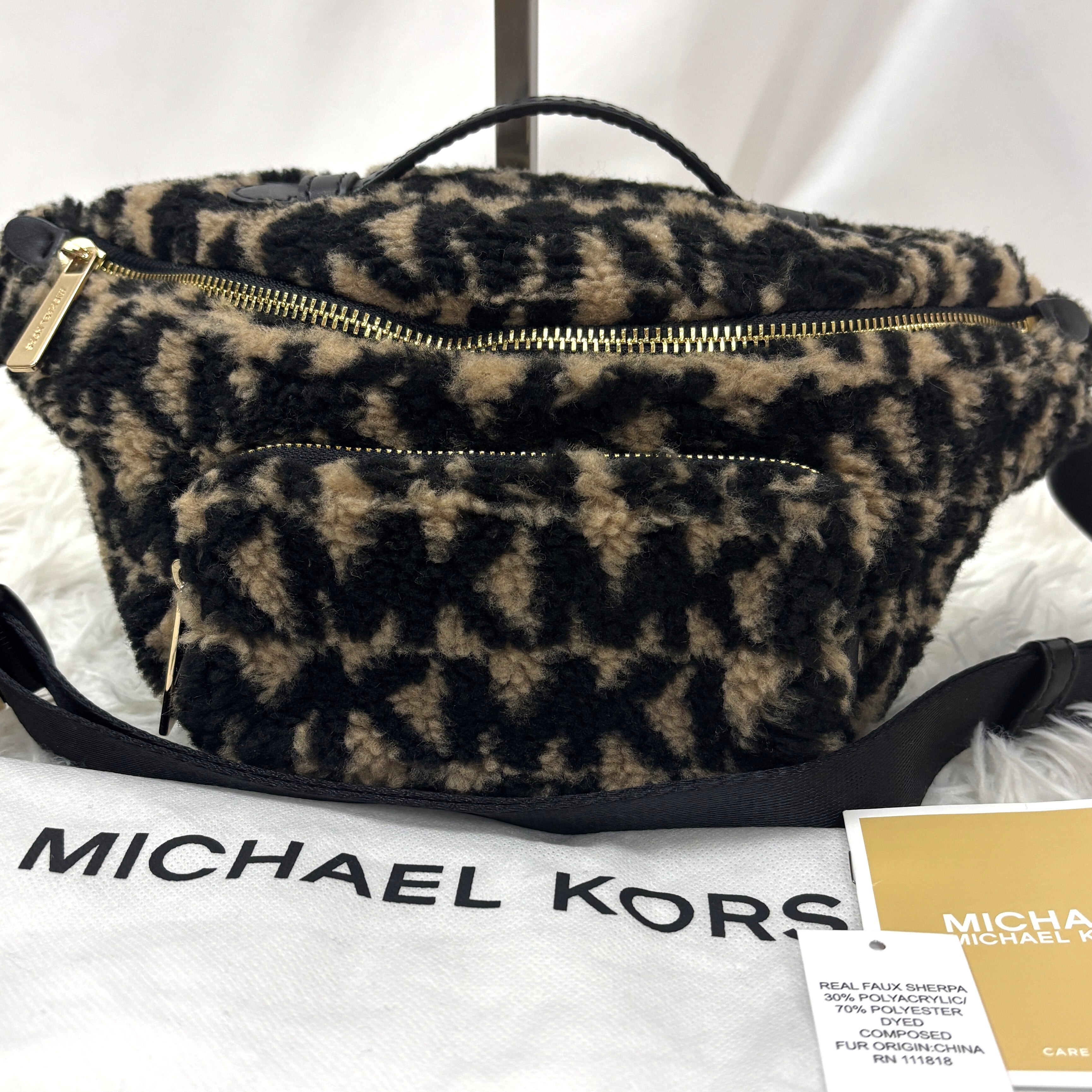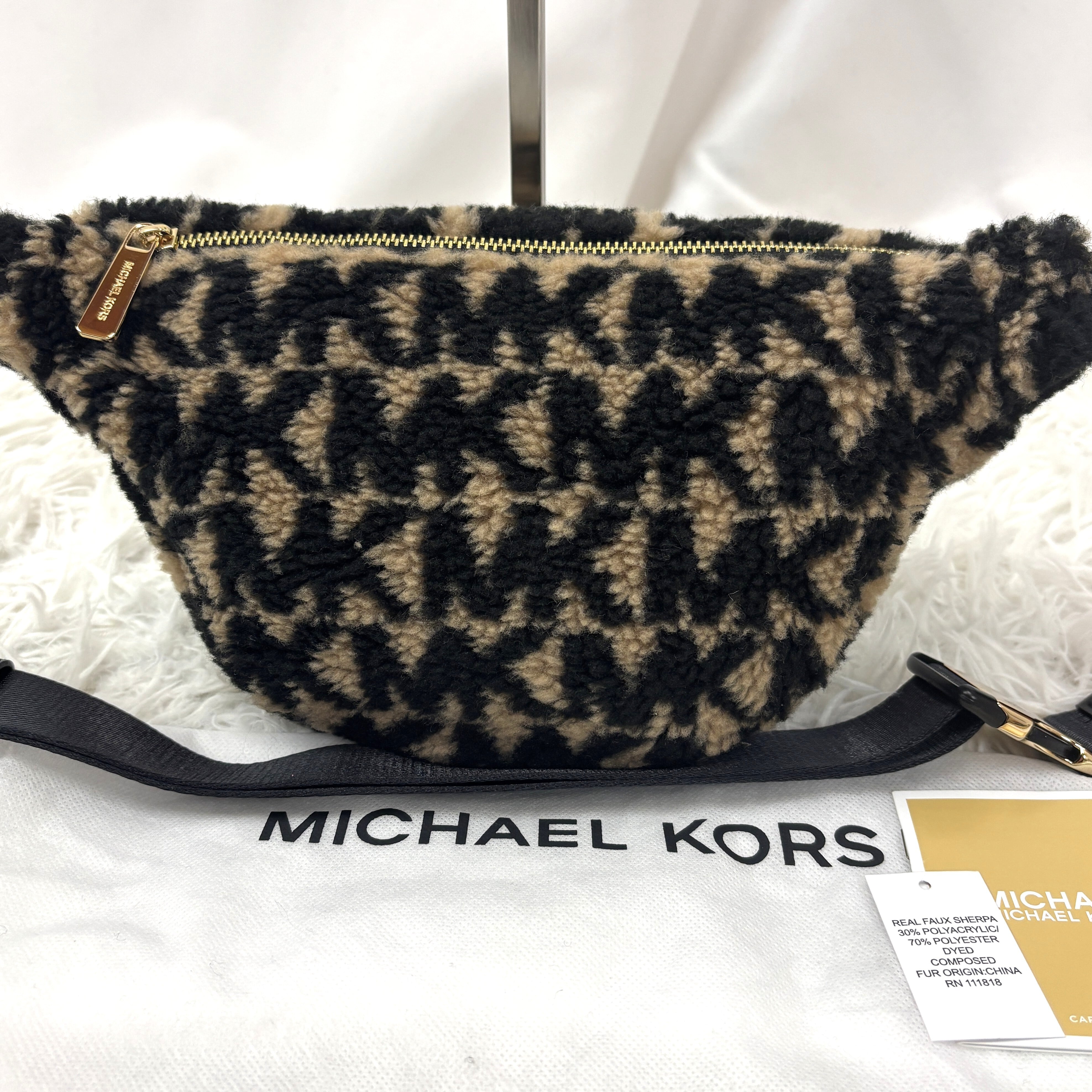 マイケルコースの人気モデル「ERINウエストバッグ」レオパード柄 フェイクファー素材のラグジュアリーな一点。