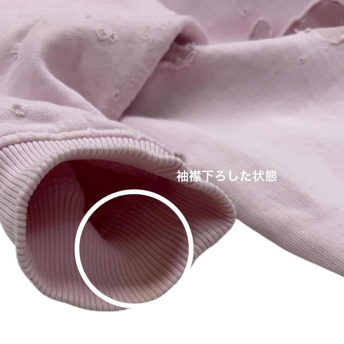 淡いピンクにダークなダメージが入ることで、甘さと無骨さのバランスが絶妙に取れた一着。