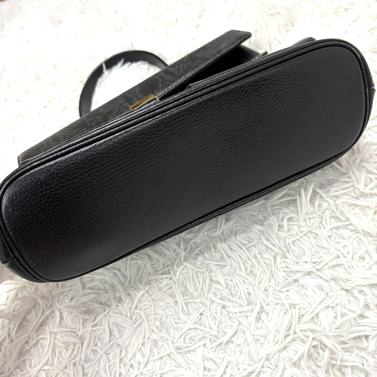 レザーの表面には、細かな型押しが施されており、シンプルながらも洗練されたデザインが光ります。ゴールドの金具が全体にリュクスな輝きを添え、品格を高めています。