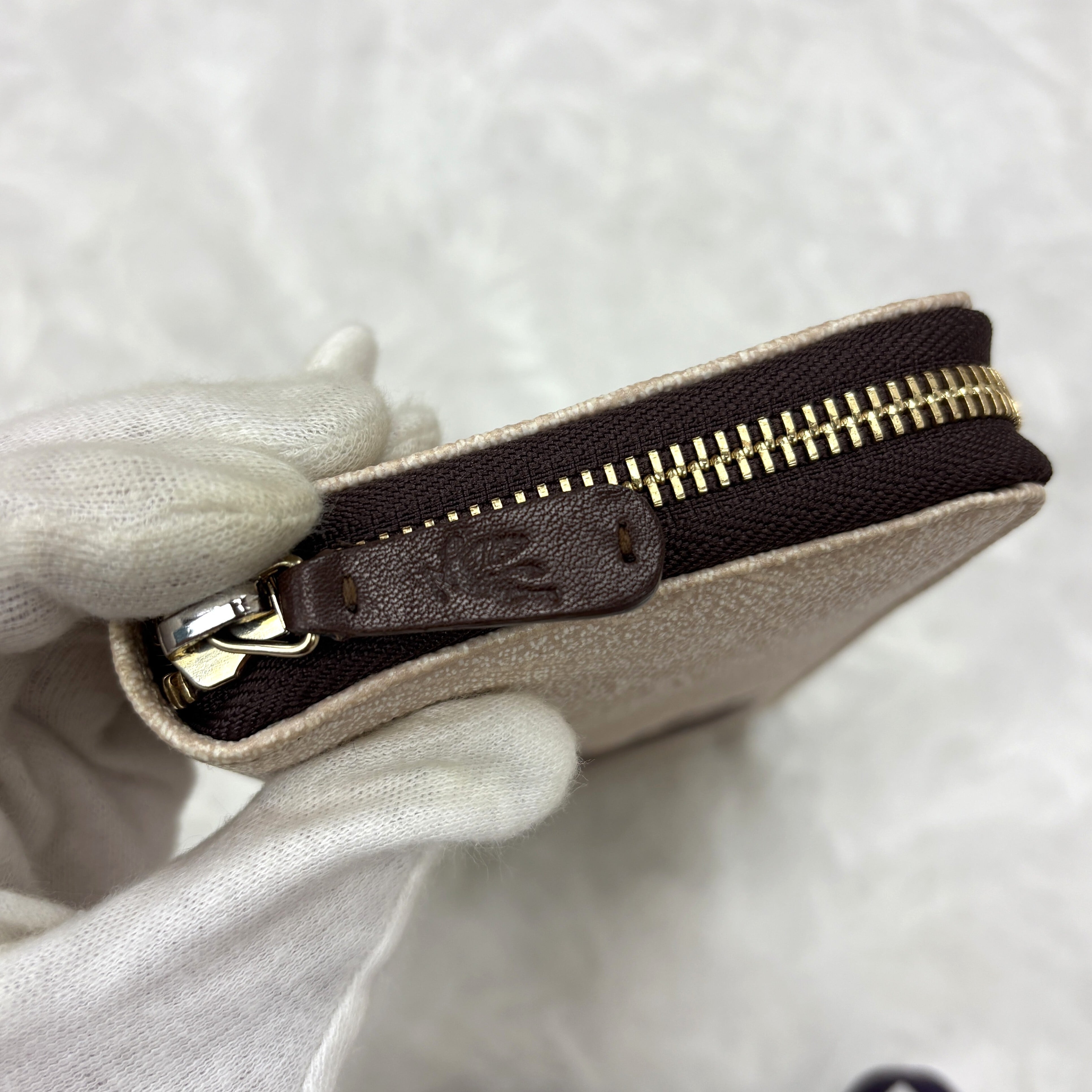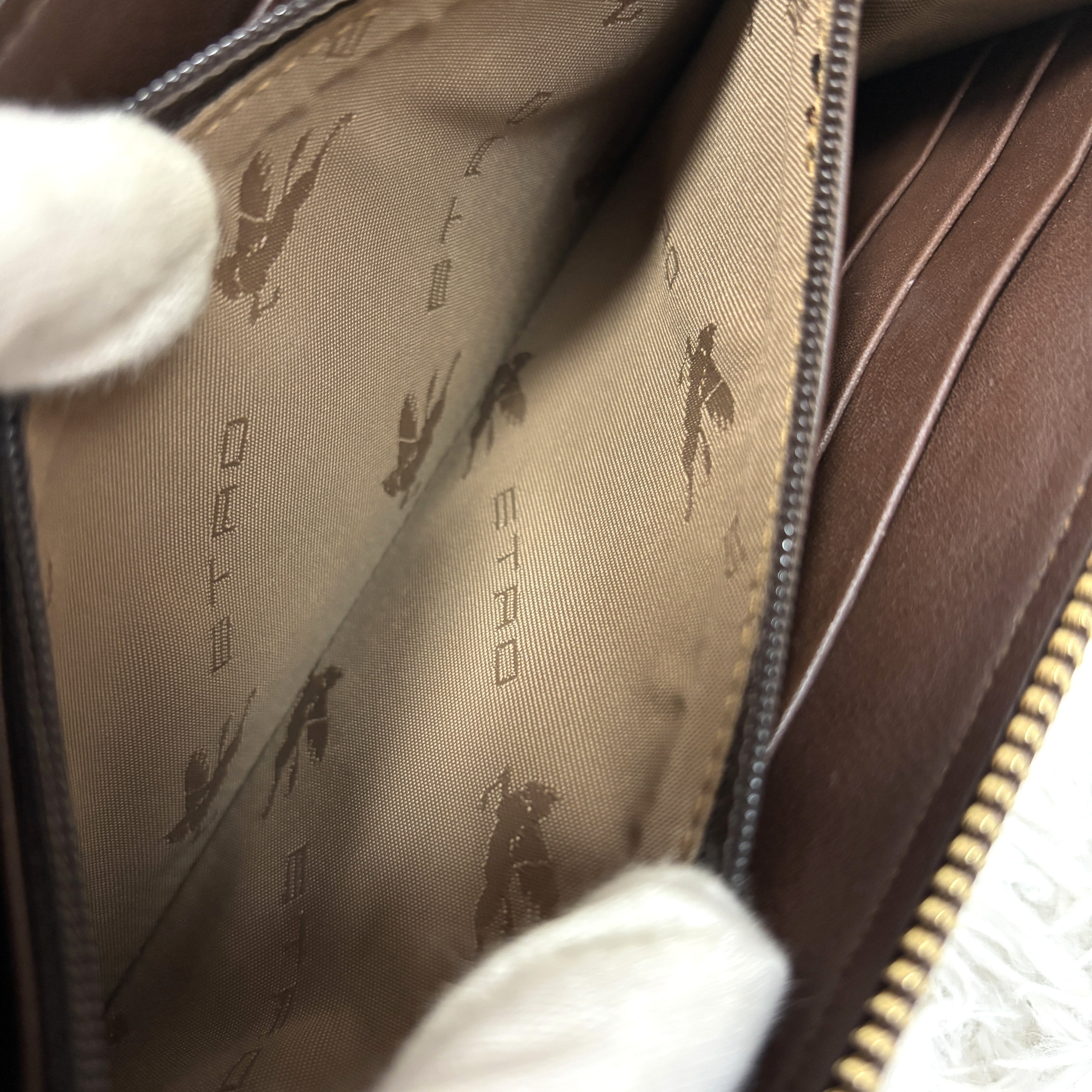 ゴールドのファスナーやペガサスロゴが高級感を演出し、内側はブラウンレザーで仕上げられており、カード収納や小銭入れも充実。