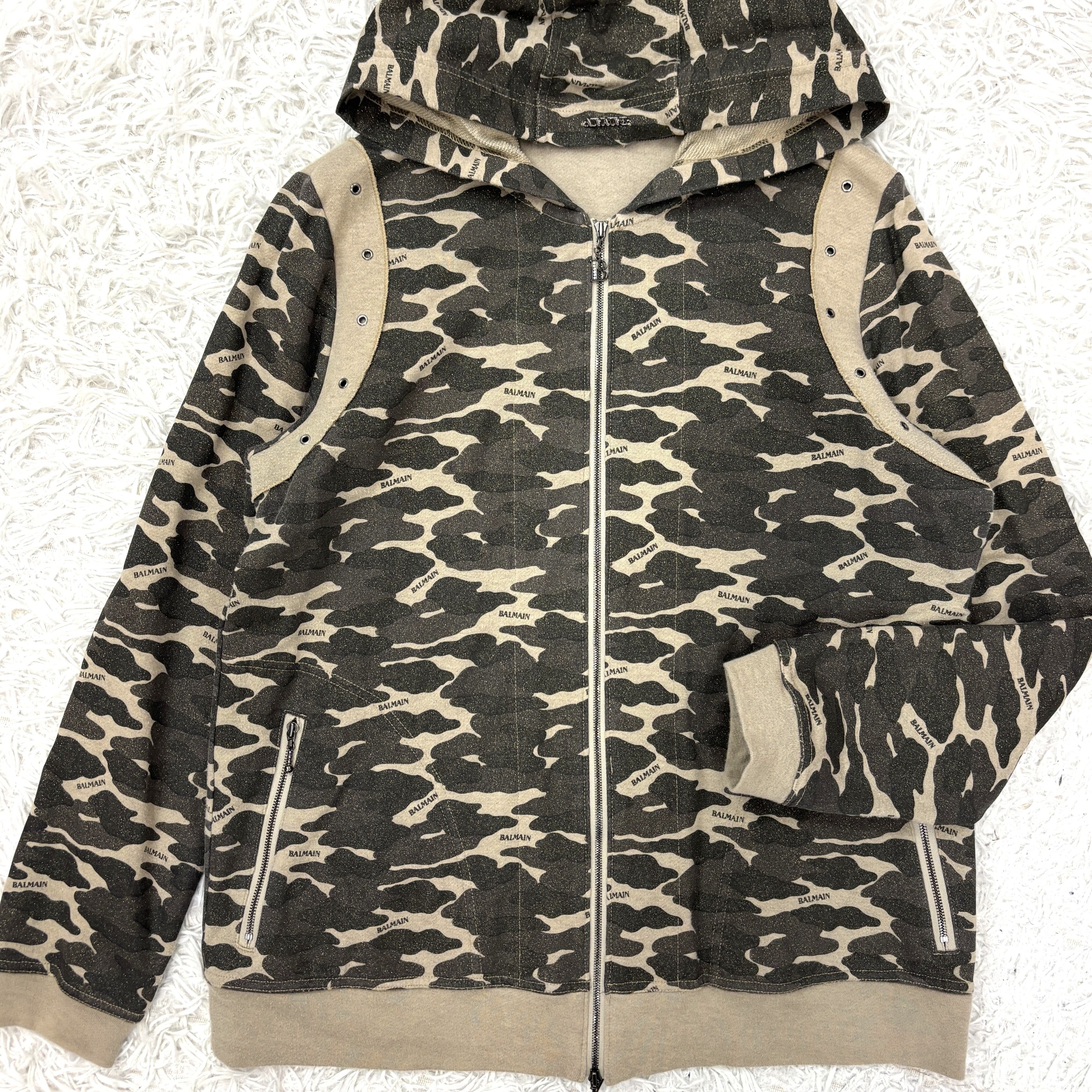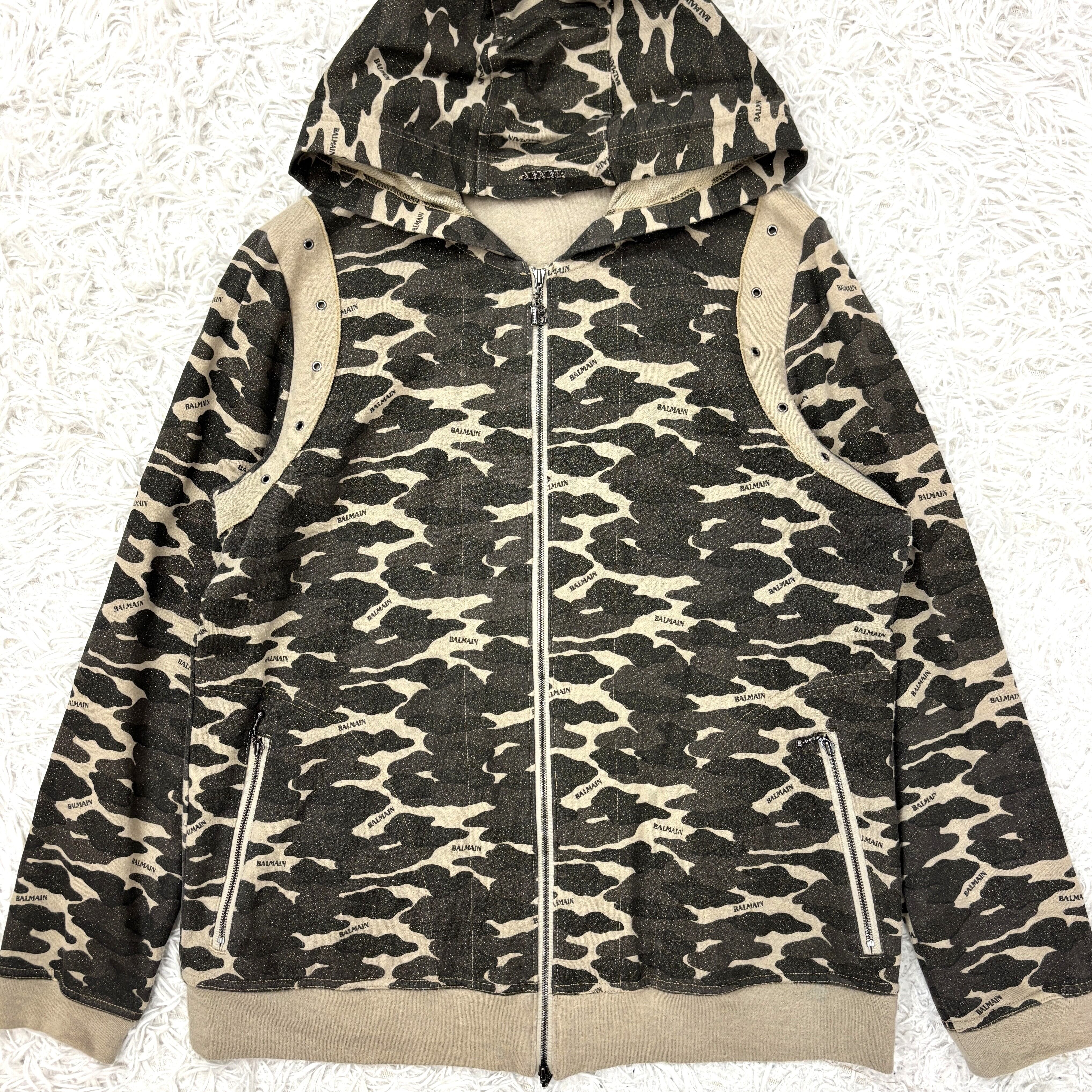 全体に「BALMAN」のゴールドラメロゴが散りばめられた、アーミーカモフラージュ柄のフルジップパーカーです。