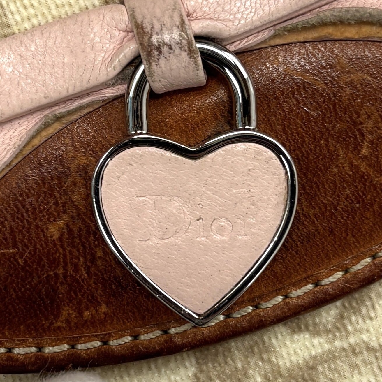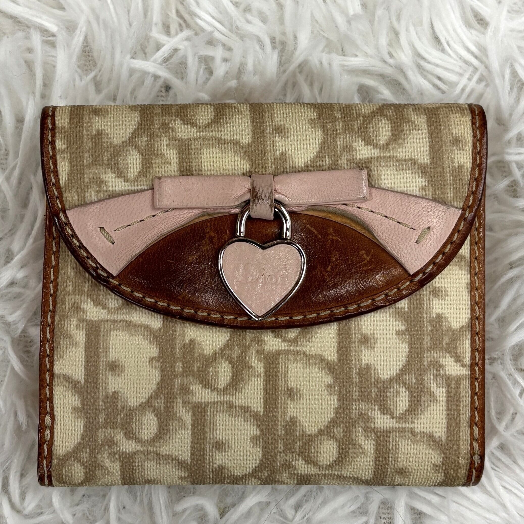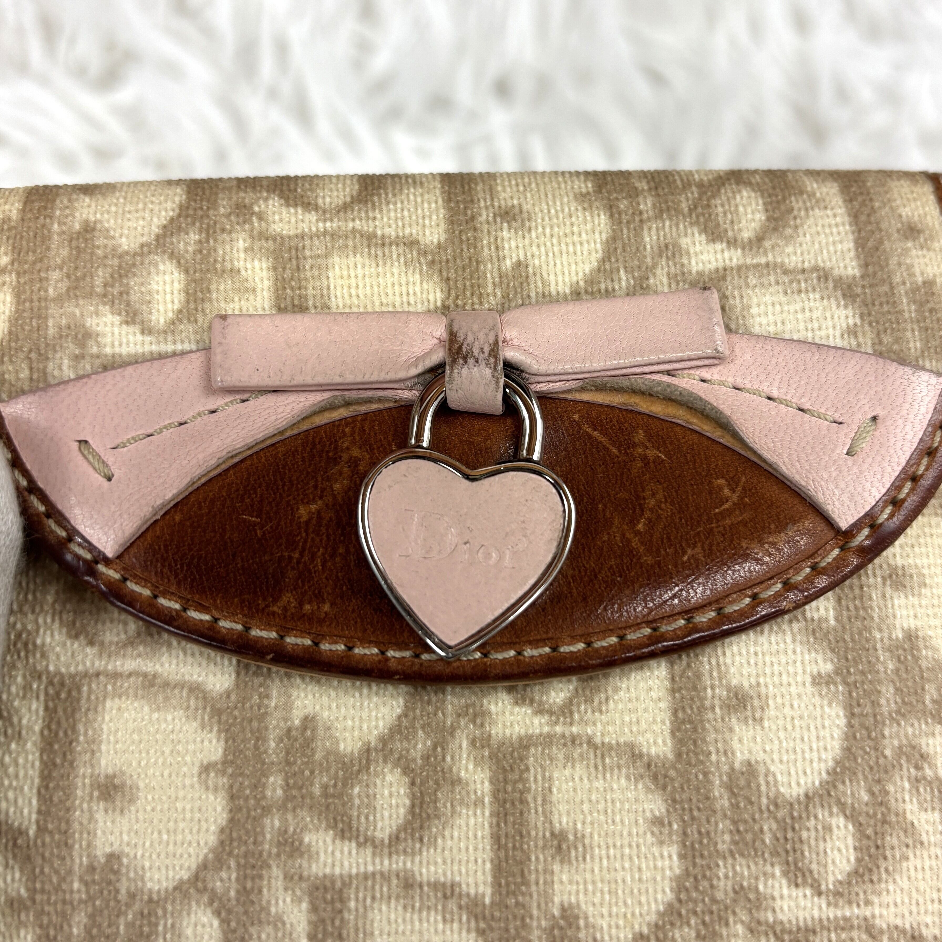 ブランドを象徴するトロッターキャンバスに、ピンクレザーのリボンとハートチャームを添えた可憐なデザインが魅力の三つ折り財布。