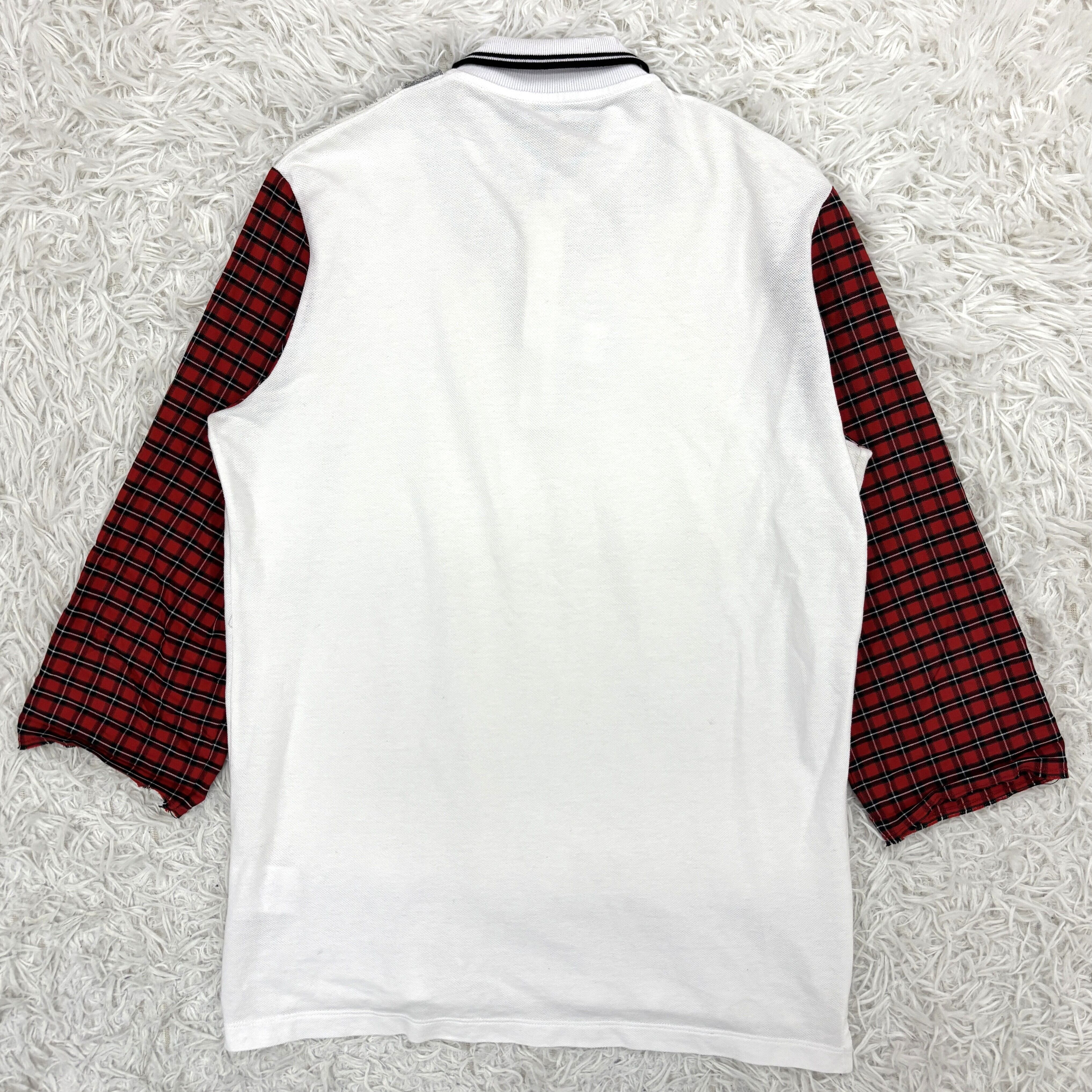 グレーのフロントデザインに、ホワイトシャツと赤チェック袖を組み合わせた大胆な切替が魅力で、一枚でスタイリングが完成する存在感のあるアイテムです。