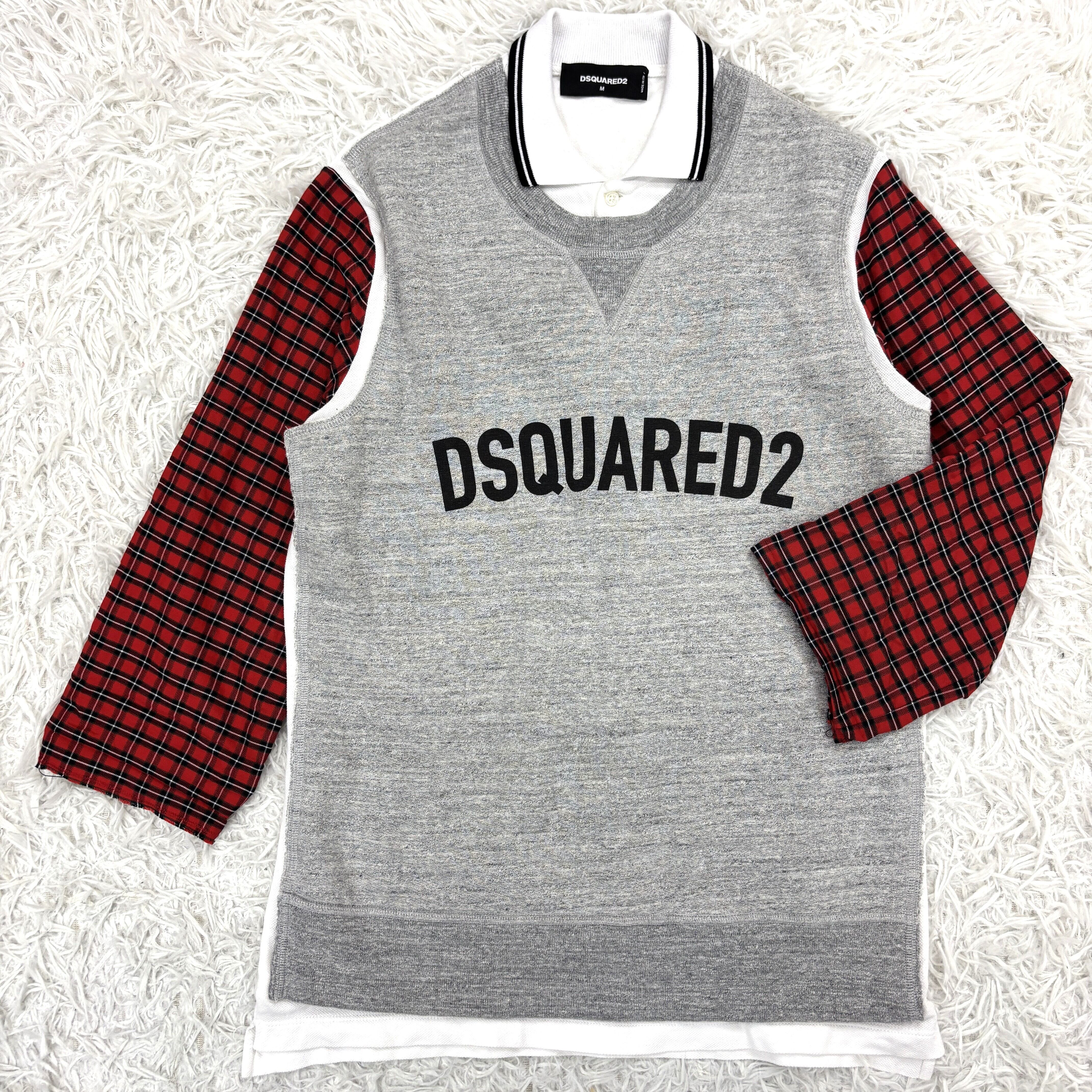 ディースクエアード 赤チェック袖 レイヤード 長袖 M ロゴプリント