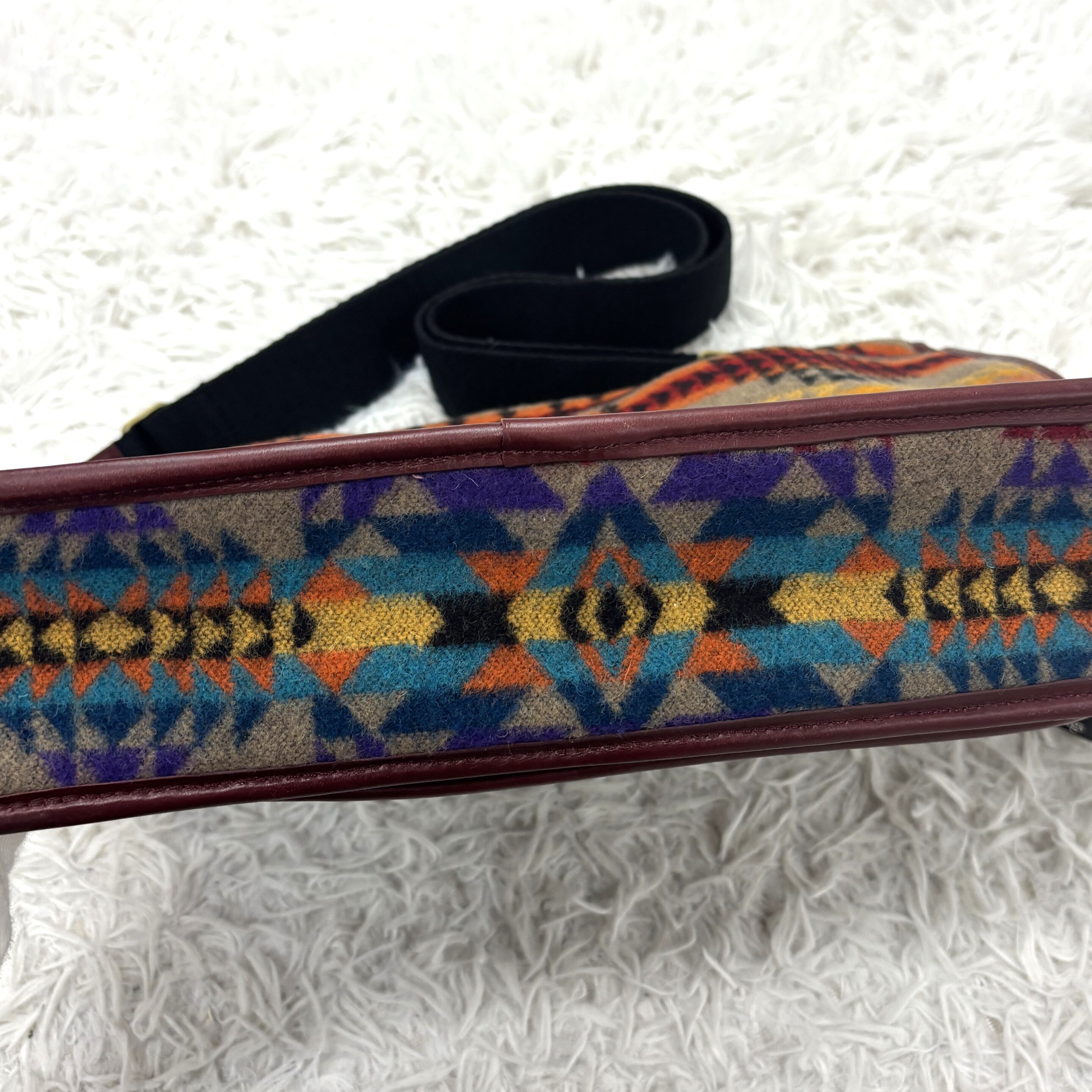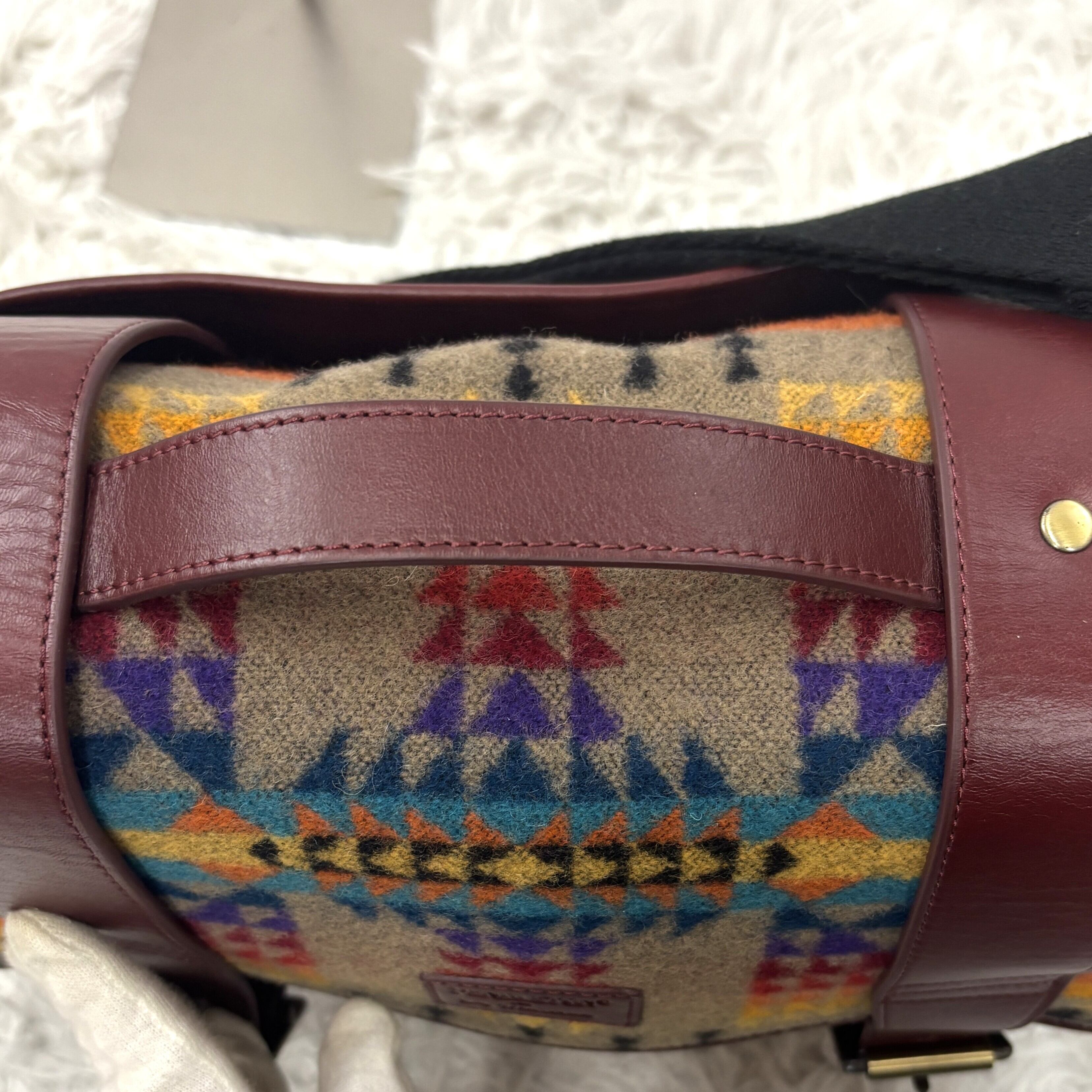 ペンドルトンの象徴的なネイティブアメリカン柄である「パゴサ・スプリングス」パターンのウール生地が全面に使用されています。