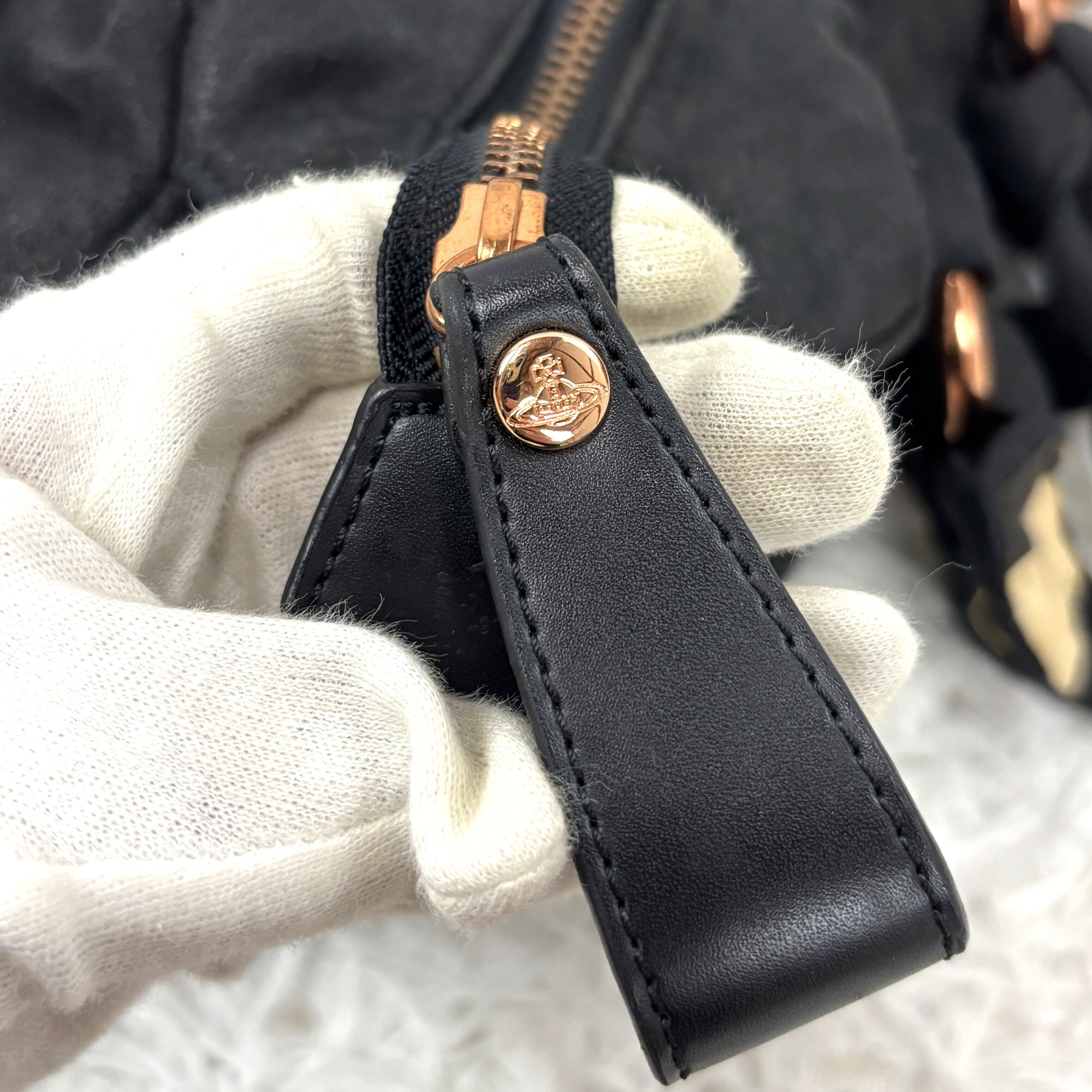 ブランドを象徴するオーブロゴ金具と、リボンのように結ばれたハンドル・リング状のメタルパーツがヴィヴィアンらしいアートとしてのバッグを体現しています。